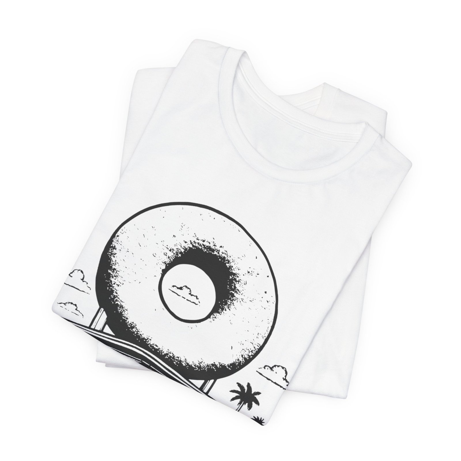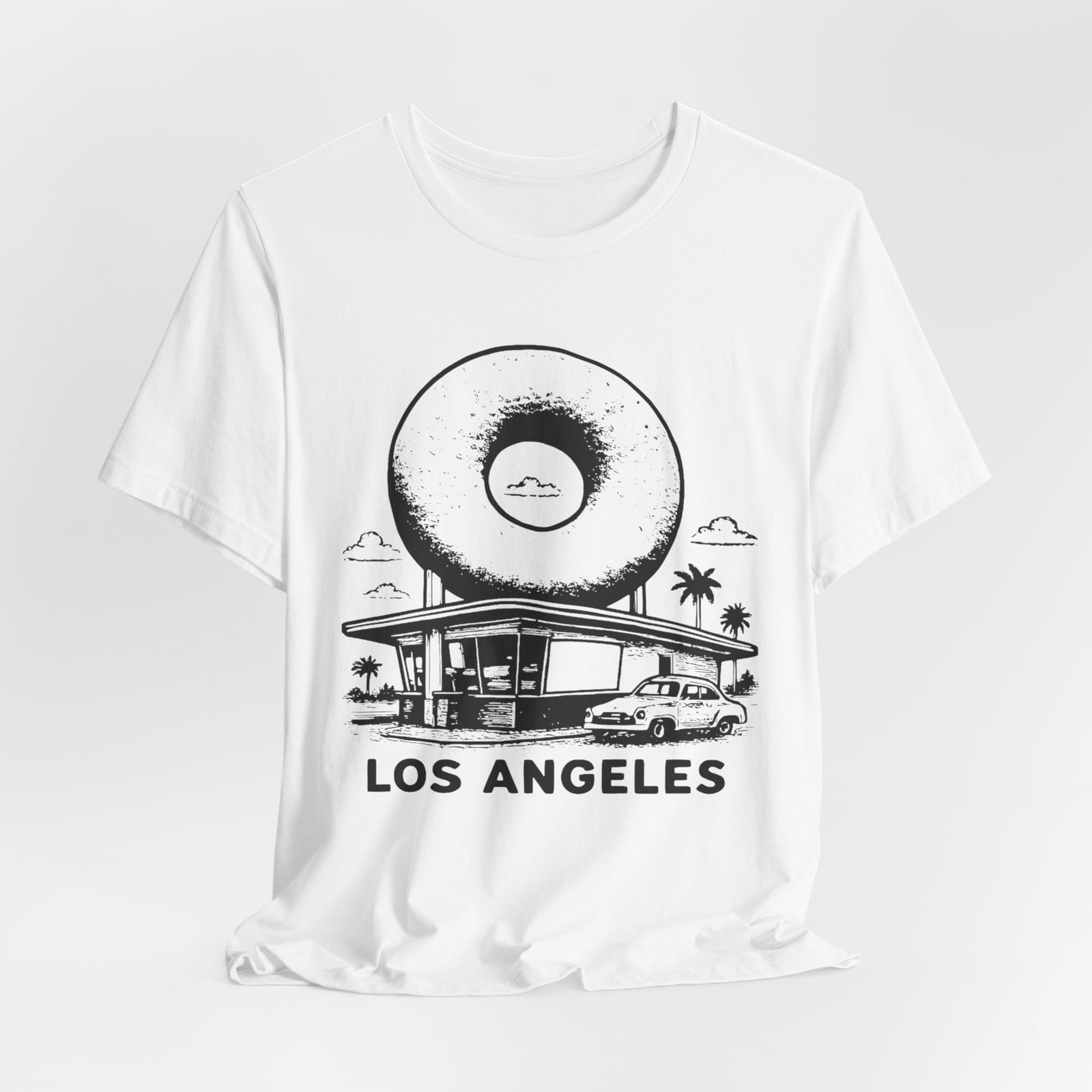 This lightweight tee carries a slice of Los Angeles streets and sunshine. A vintage-style sketch — a classic donut shop, lowrider, and swaying palms beneath a giant doughnut halo — sits front and center in crisp monochrome. The soft, breathable cotton drapes easy from morning coffee runs to evening drives along the coast. It feels lived-in from the first wear, with a clean crew neckline and side seams that keep the silhouette tidy. Wear it to nod to city rituals, good neighborhoods, and the slow, salty rhythm of SoCal life.