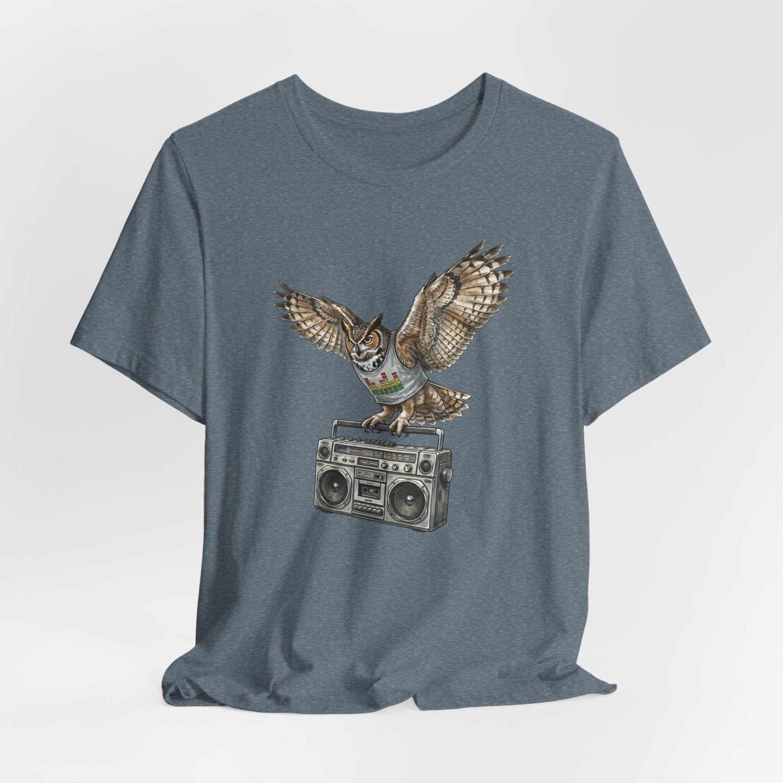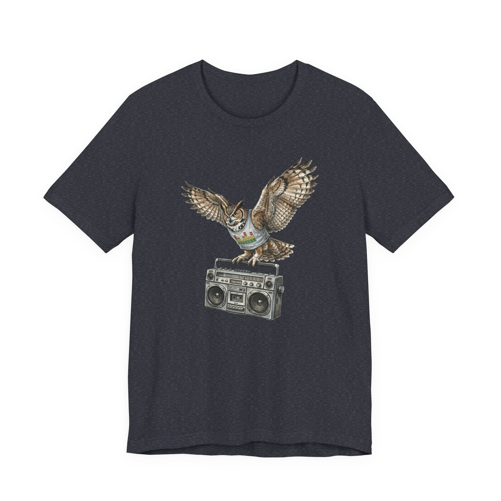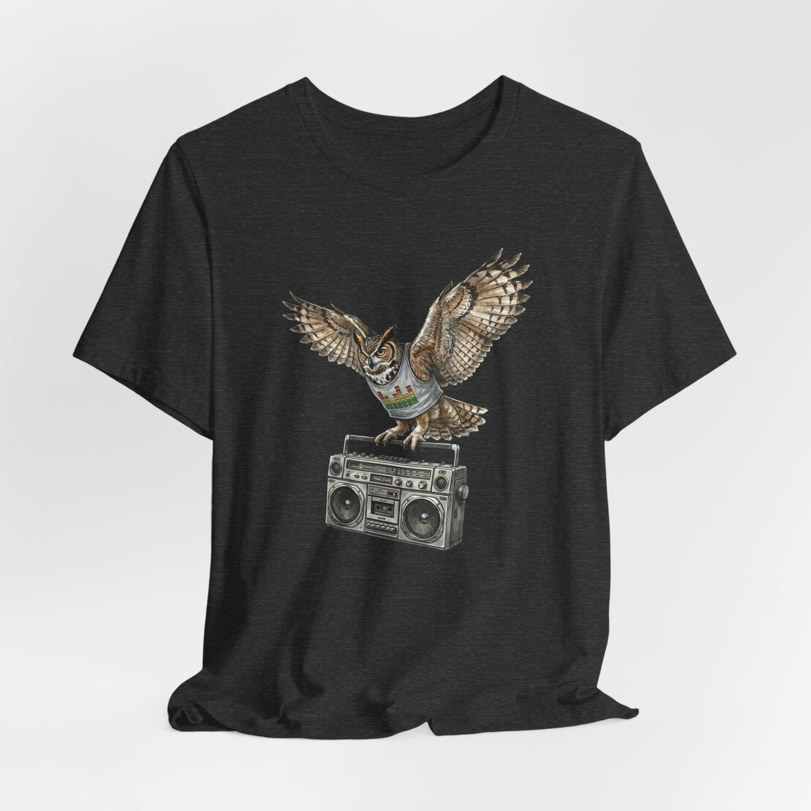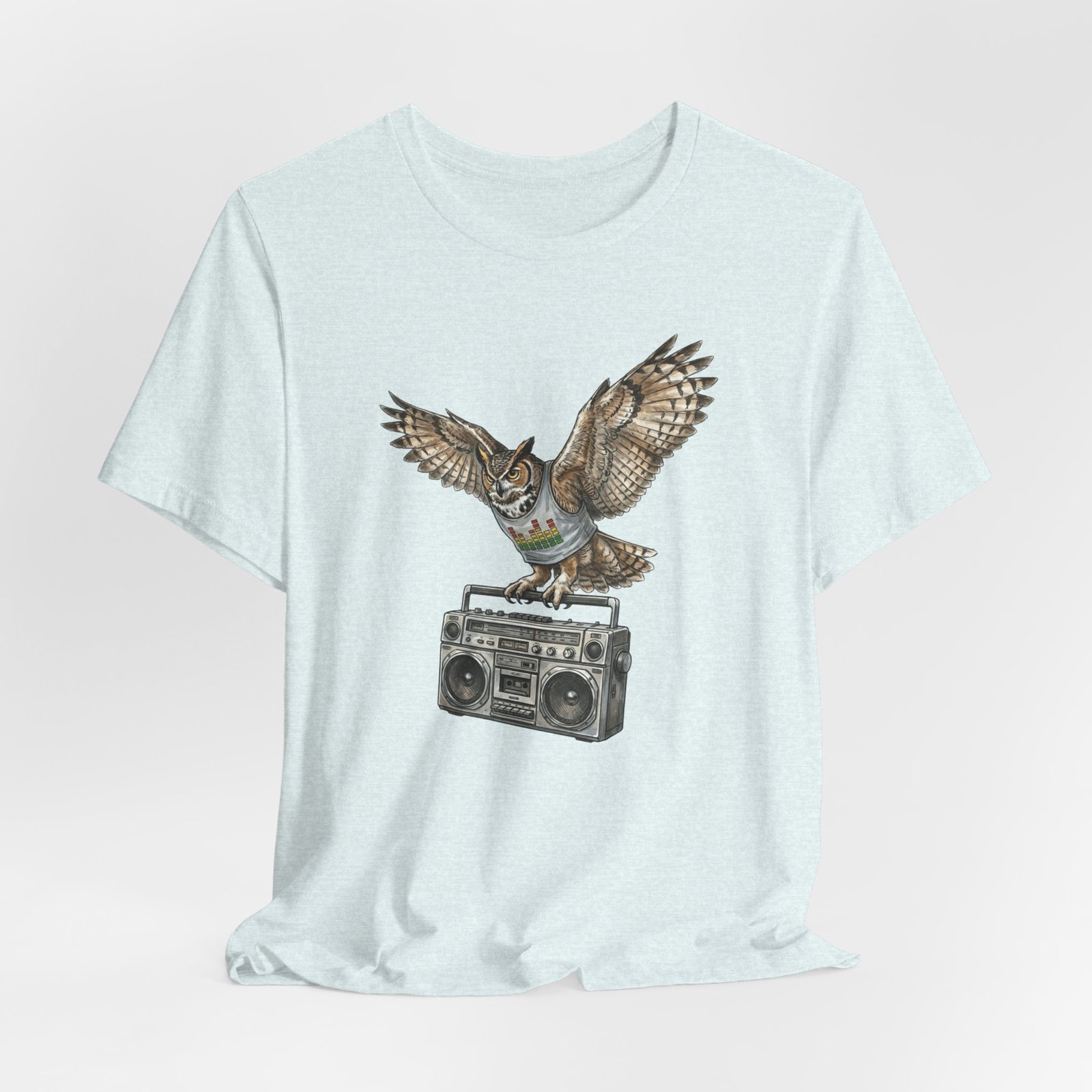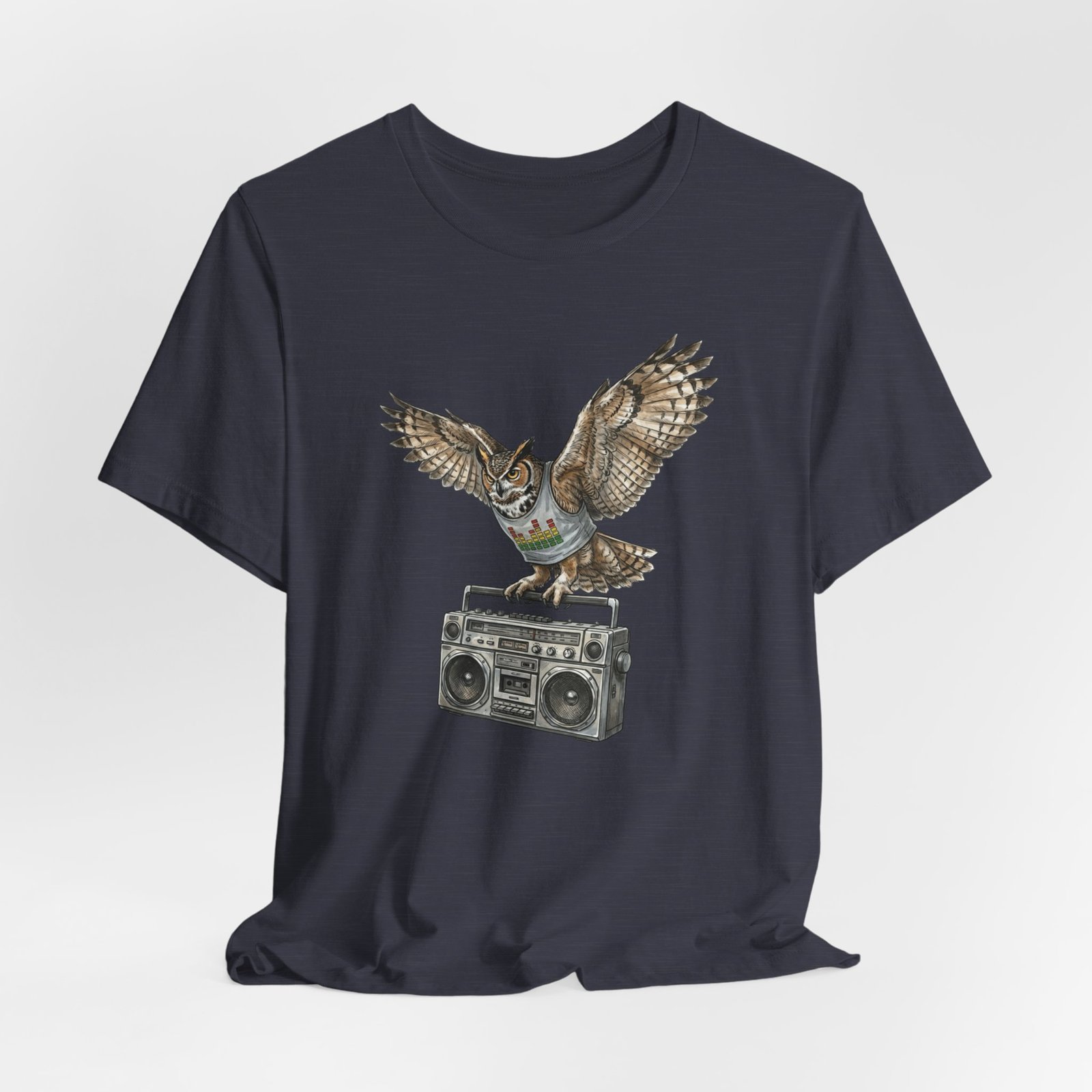This soft, breathable jersey tee carries a quiet kind of confidence — a vintage boombox anchored mid-century cool, crowned by a watchful owl in flight. The illustration blends hand-drawn texture with muted earth tones that sit naturally on the light heather fabric, inviting relaxed days, record-store haunts, and late-night drives. It layers easily under a denim jacket or stands solo with worn-in jeans, adding a little story to everyday wear for someone who likes music that matters and animals that watch over the night.