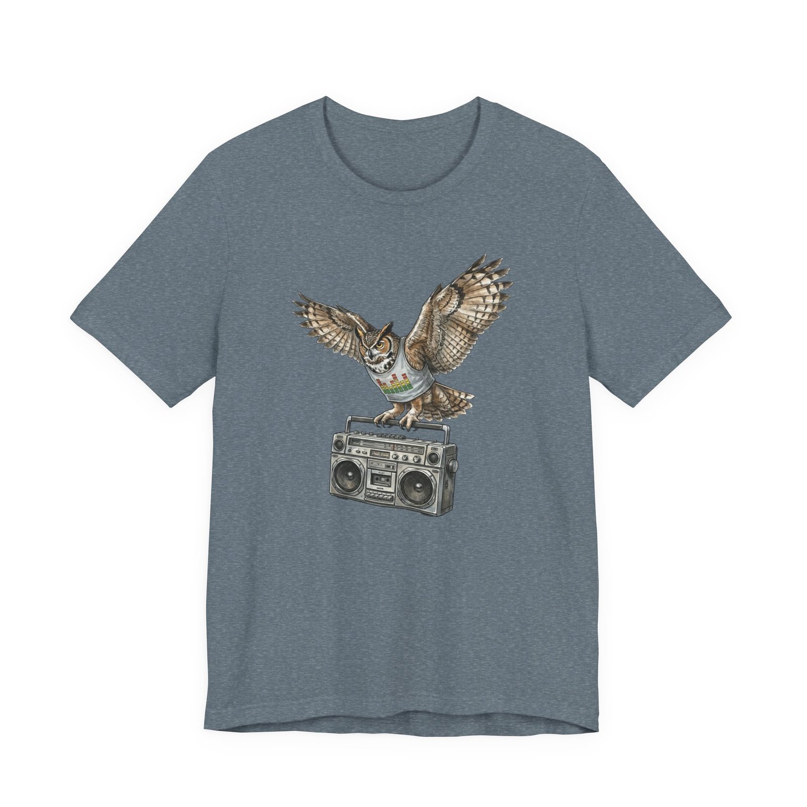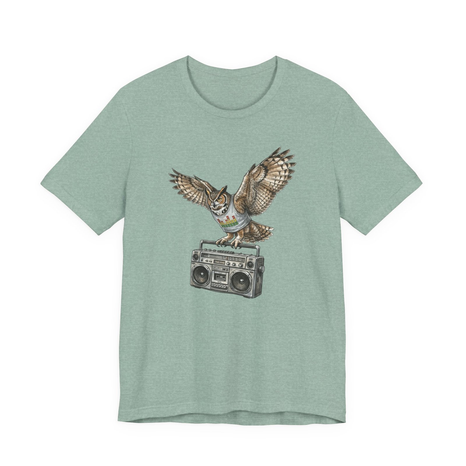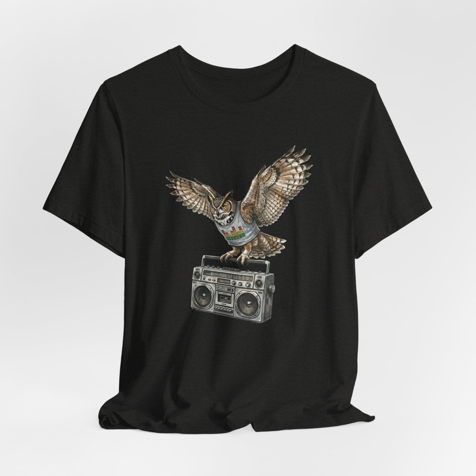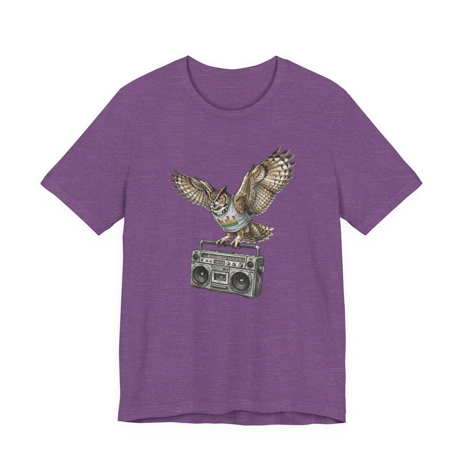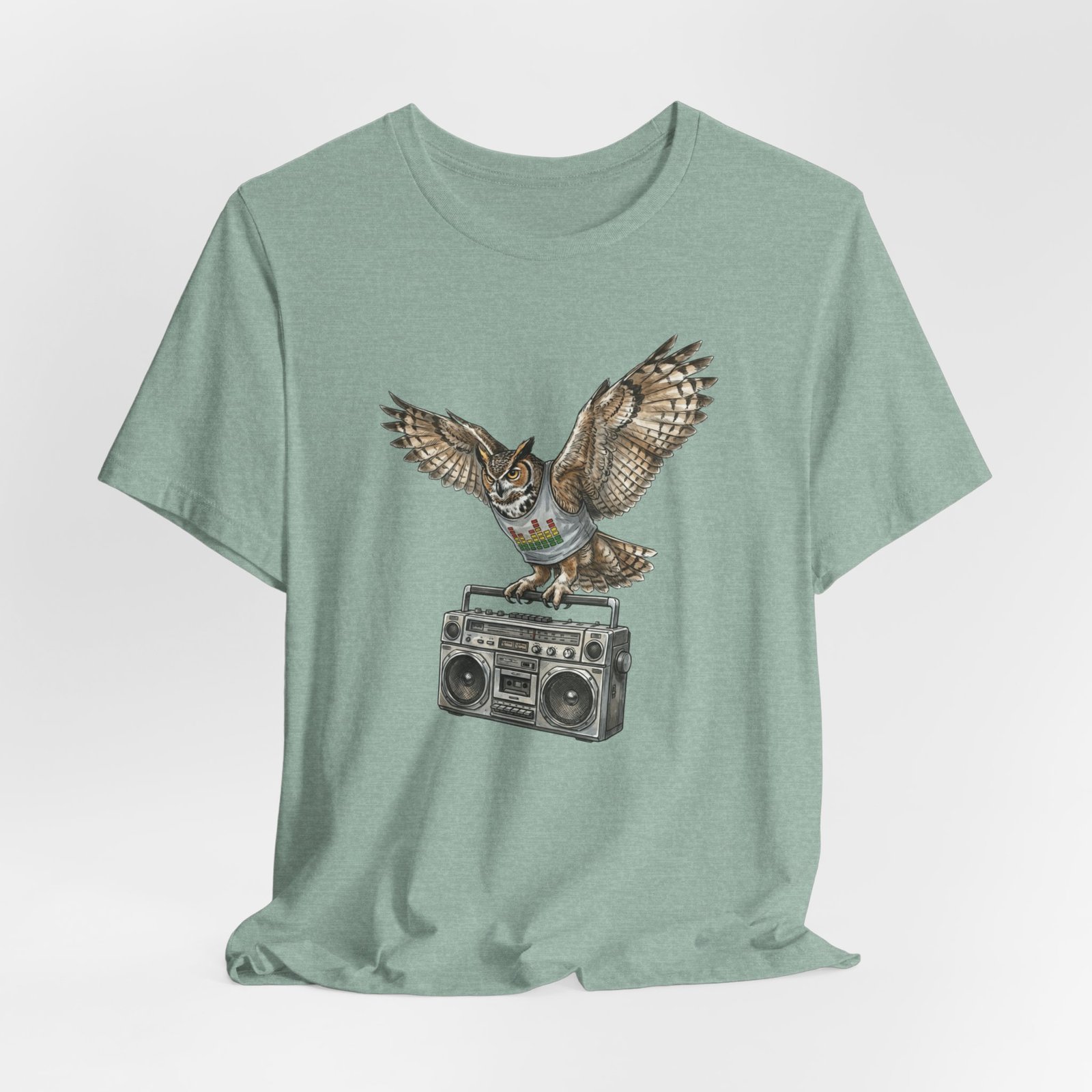This soft, breathable jersey tee carries a quiet kind of confidence — a vintage boombox anchored mid-century cool, crowned by a watchful owl in flight. The illustration blends hand-drawn texture with muted earth tones that sit naturally on the light heather fabric, inviting relaxed days, record-store haunts, and late-night drives. It layers easily under a denim jacket or stands solo with worn-in jeans, adding a little story to everyday wear for someone who likes music that matters and animals that watch over the night.