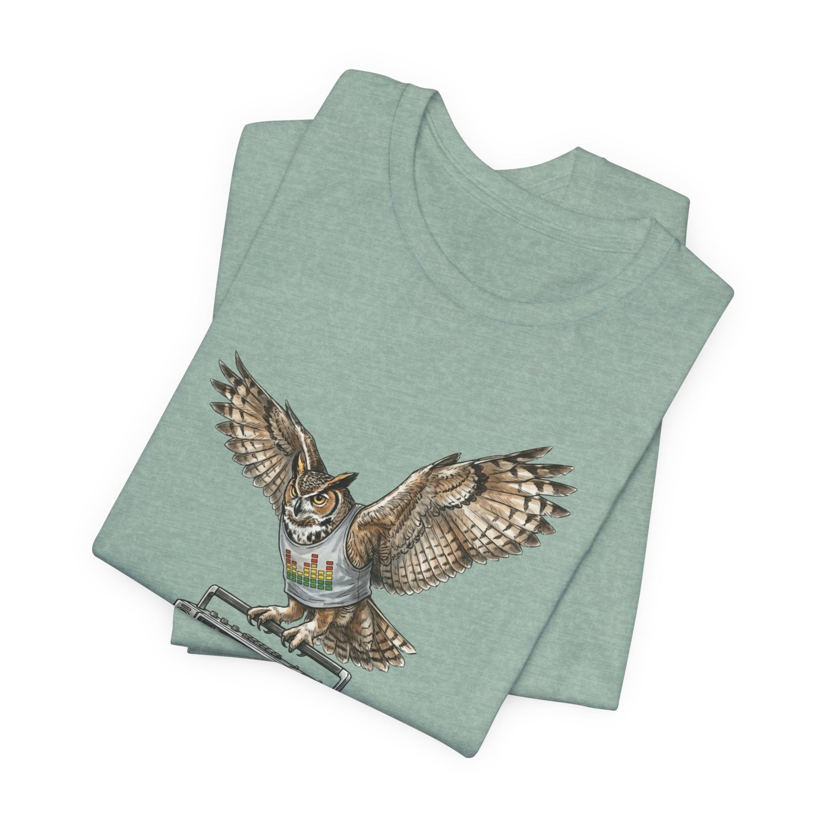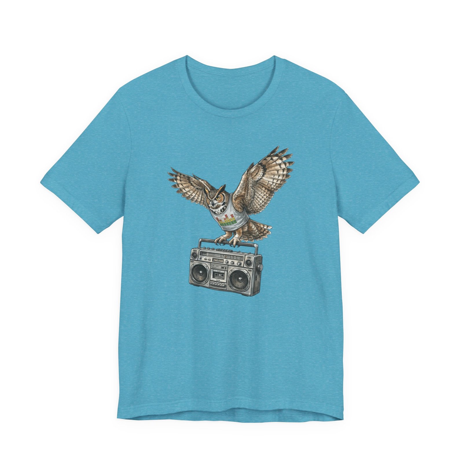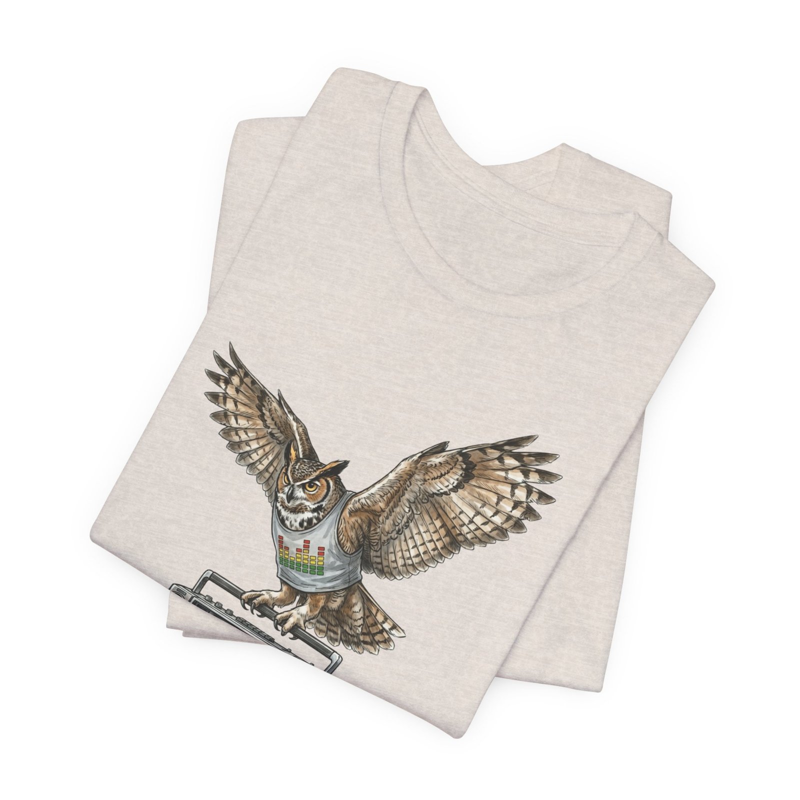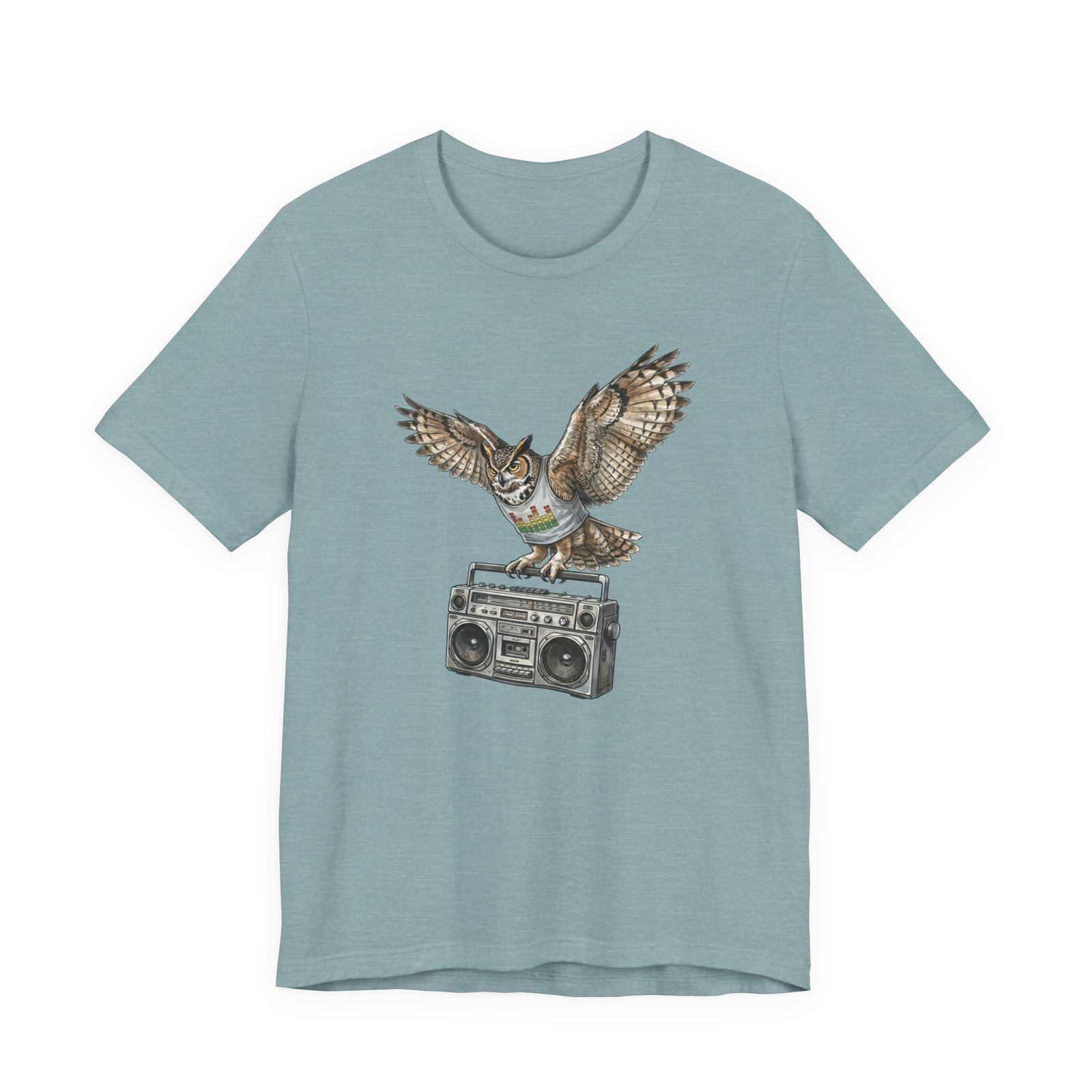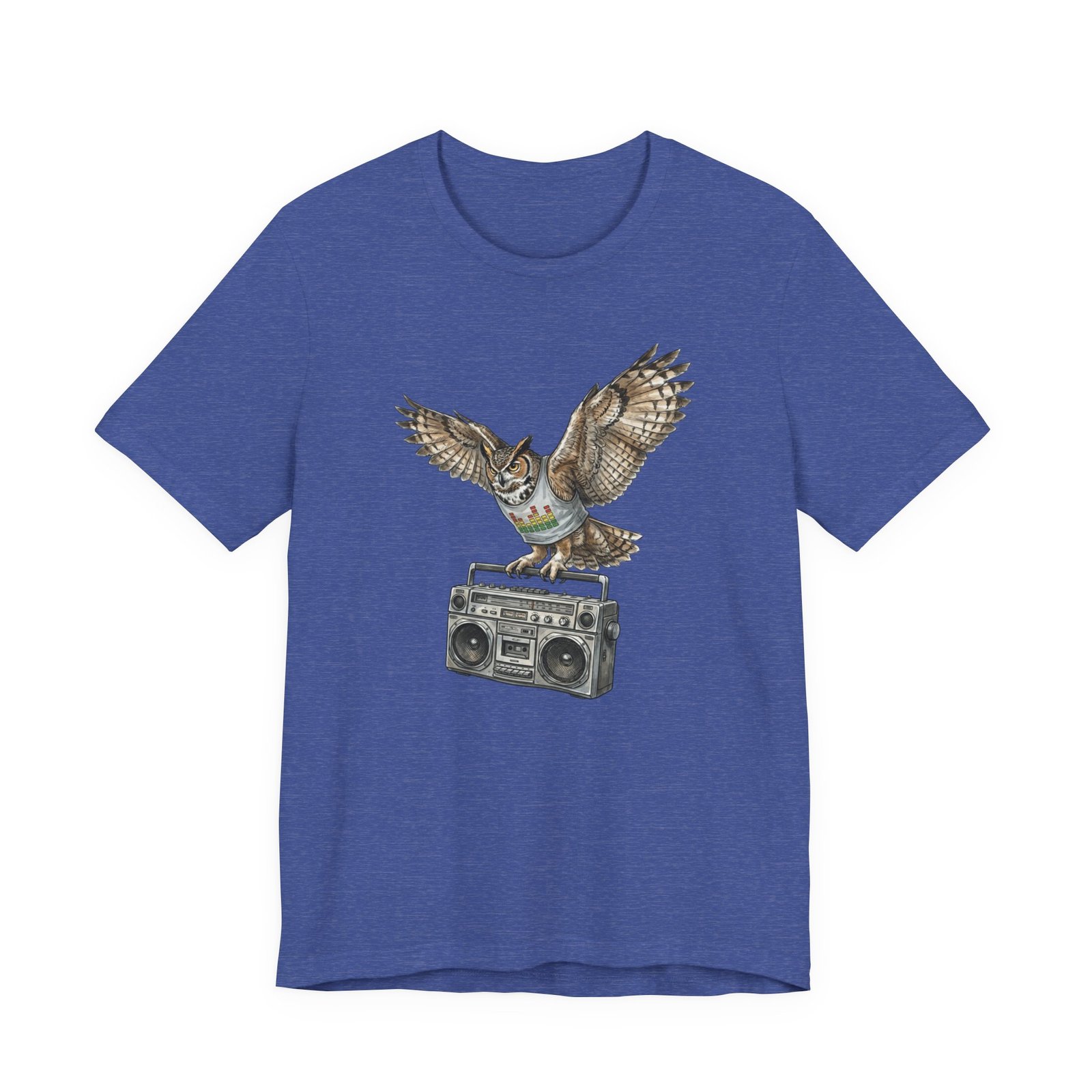 This soft, breathable jersey tee carries a quiet kind of confidence — a vintage boombox anchored mid-century cool, crowned by a watchful owl in flight. The illustration blends hand-drawn texture with muted earth tones that sit naturally on the light heather fabric, inviting relaxed days, record-store haunts, and late-night drives. It layers easily under a denim jacket or stands solo with worn-in jeans, adding a little story to everyday wear for someone who likes music that matters and animals that watch over the night.