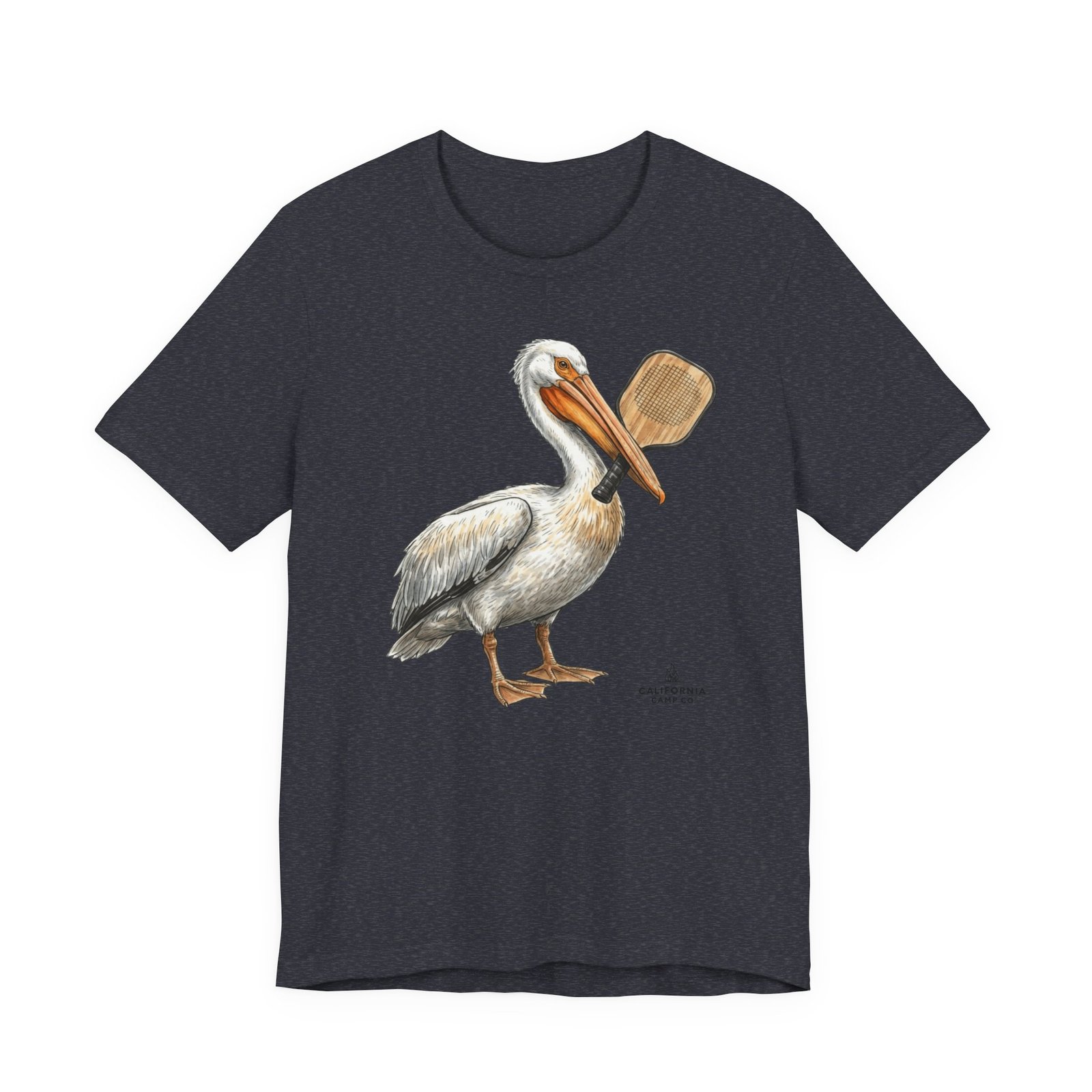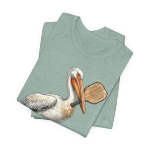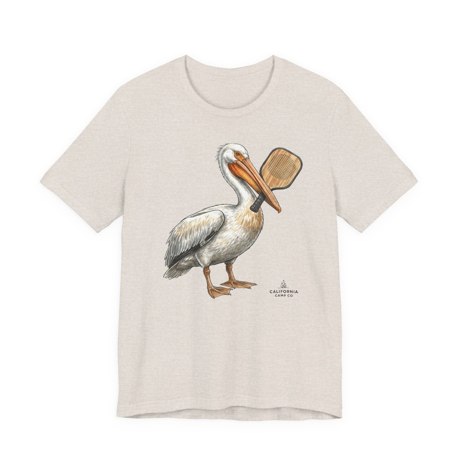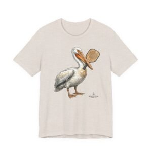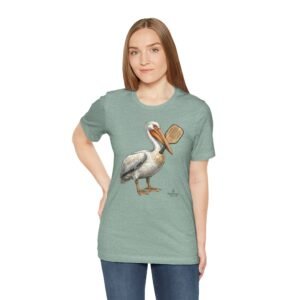 Soft, breathable tee with a hand-drawn pelican holding a pickleball paddle — it feels like a slow morning on the bay. Lightweight Airlume combed cotton drapes easily over layers and keeps you cool while exploring tide pools or grabbing coffee after a sunrise paddle. The subtle, painterly illustration sits on a neutral heather ground so the art reads like a quiet souvenir rather than loud branding. Wear it with rolled sleeves and sun-faded denim for salty, lived-in style that speaks to people who love coastal life and simple, outdoor rhythms.