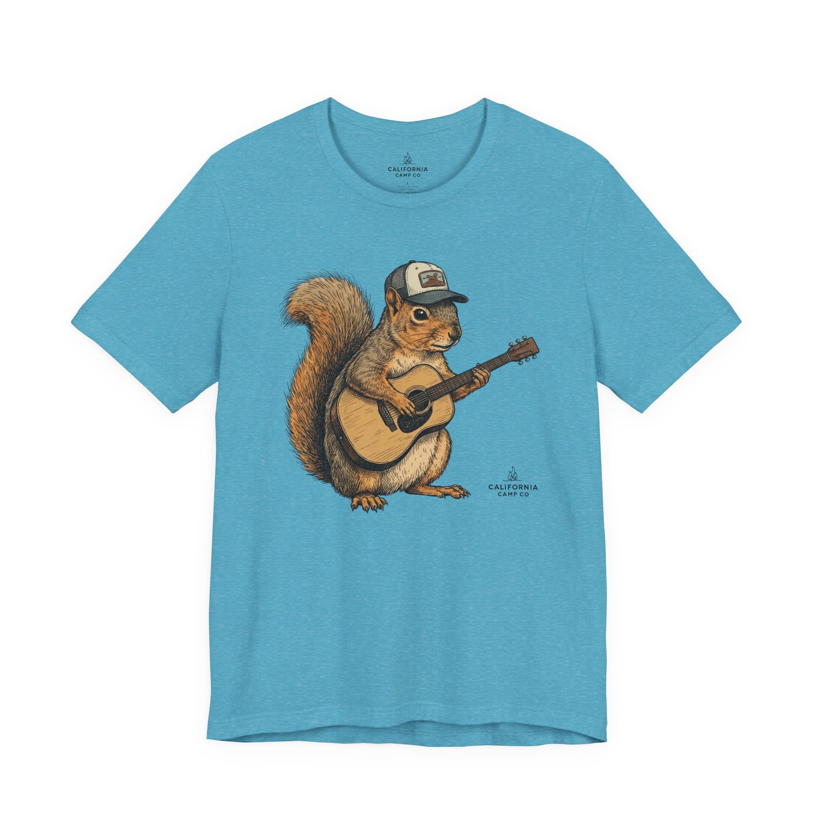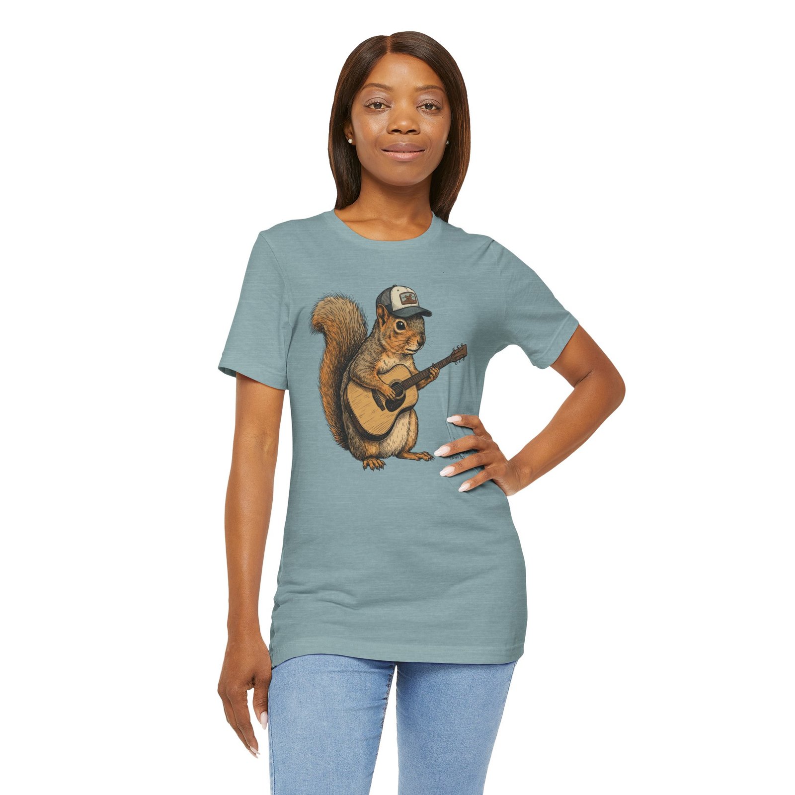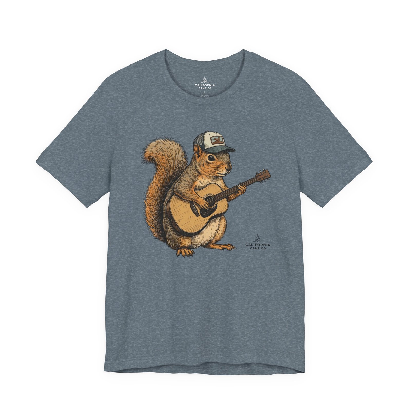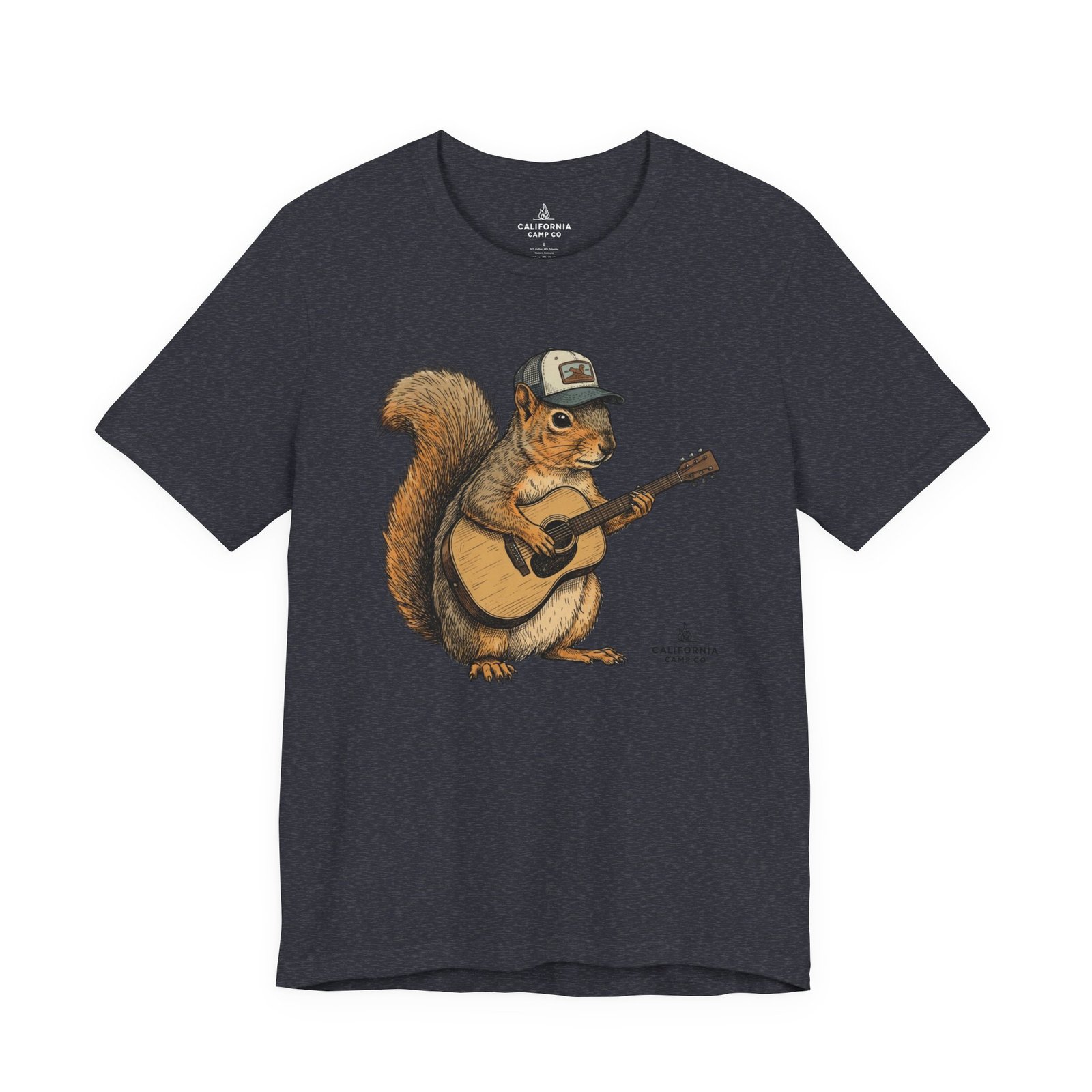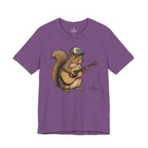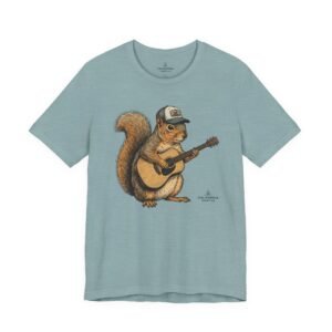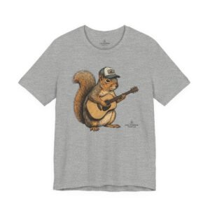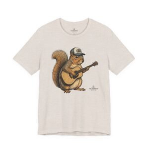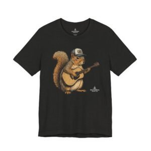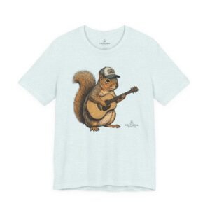 Lightweight, breathable tee that feels lived-in from day one. The soft Airlume cotton fabric drapes casually, while the ribbed crew neck and side seams keep the shape through active days. On the front, a hand-illustrated squirrel in a trucker cap strums an acoustic guitar — a little roadside troubadour that brings quiet charm to hikes, coffee runs, and slow Sundays. Wear it layered under a flannel for campfire nights or on its own for easy, music-filled afternoons. The printed neck label is soft against skin and the tear-away option keeps irritation away. Responsibly made and REACH certified, this shirt blends comfort, conscience, and a touch of rustic humor.