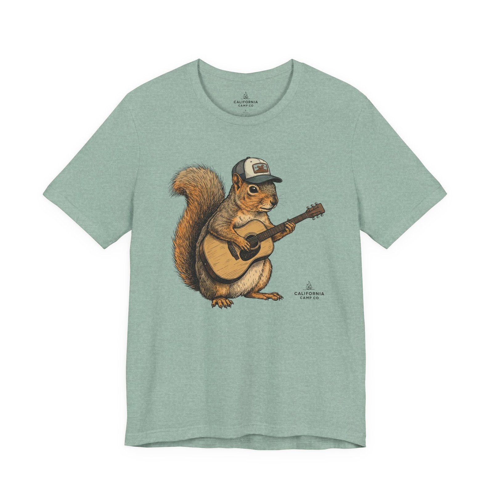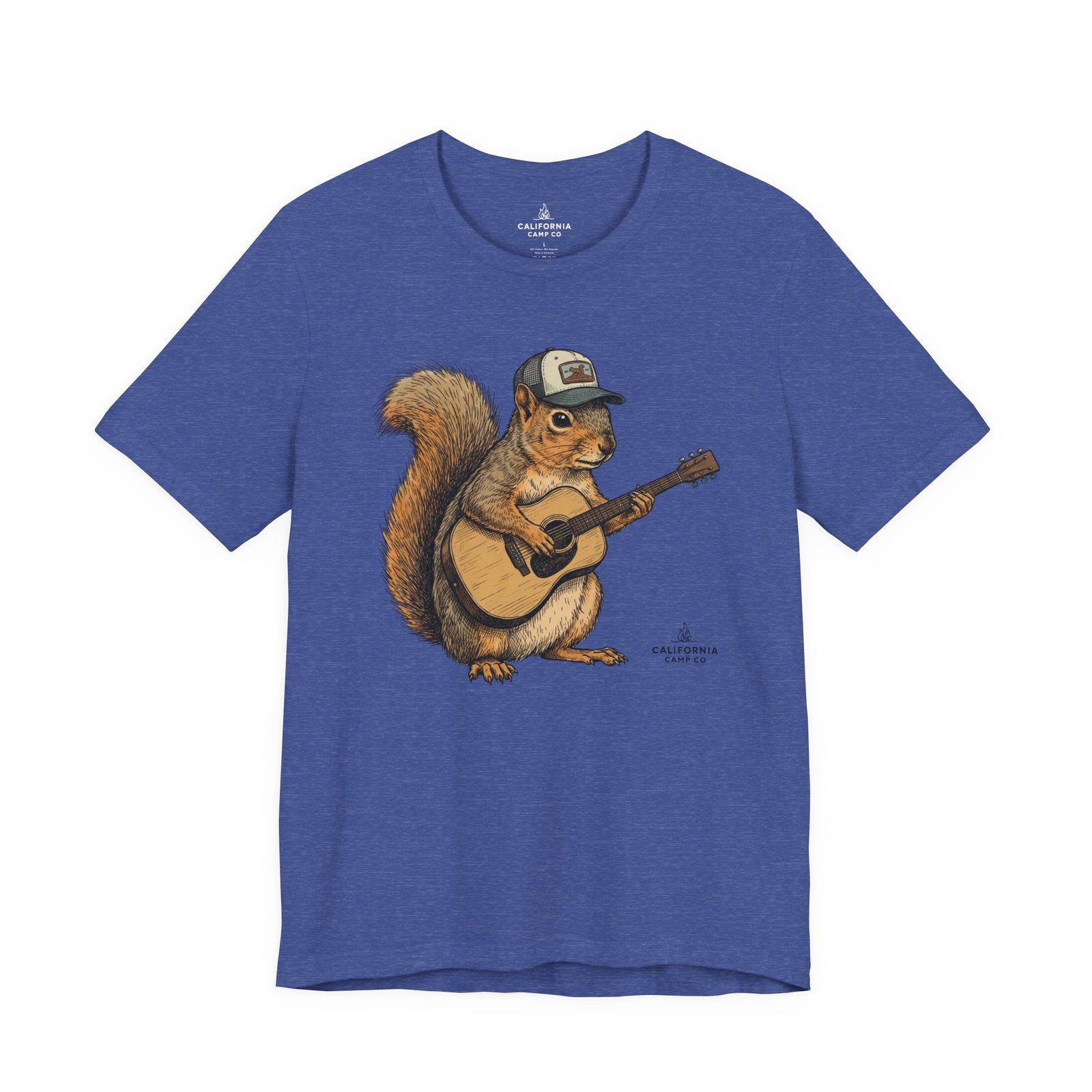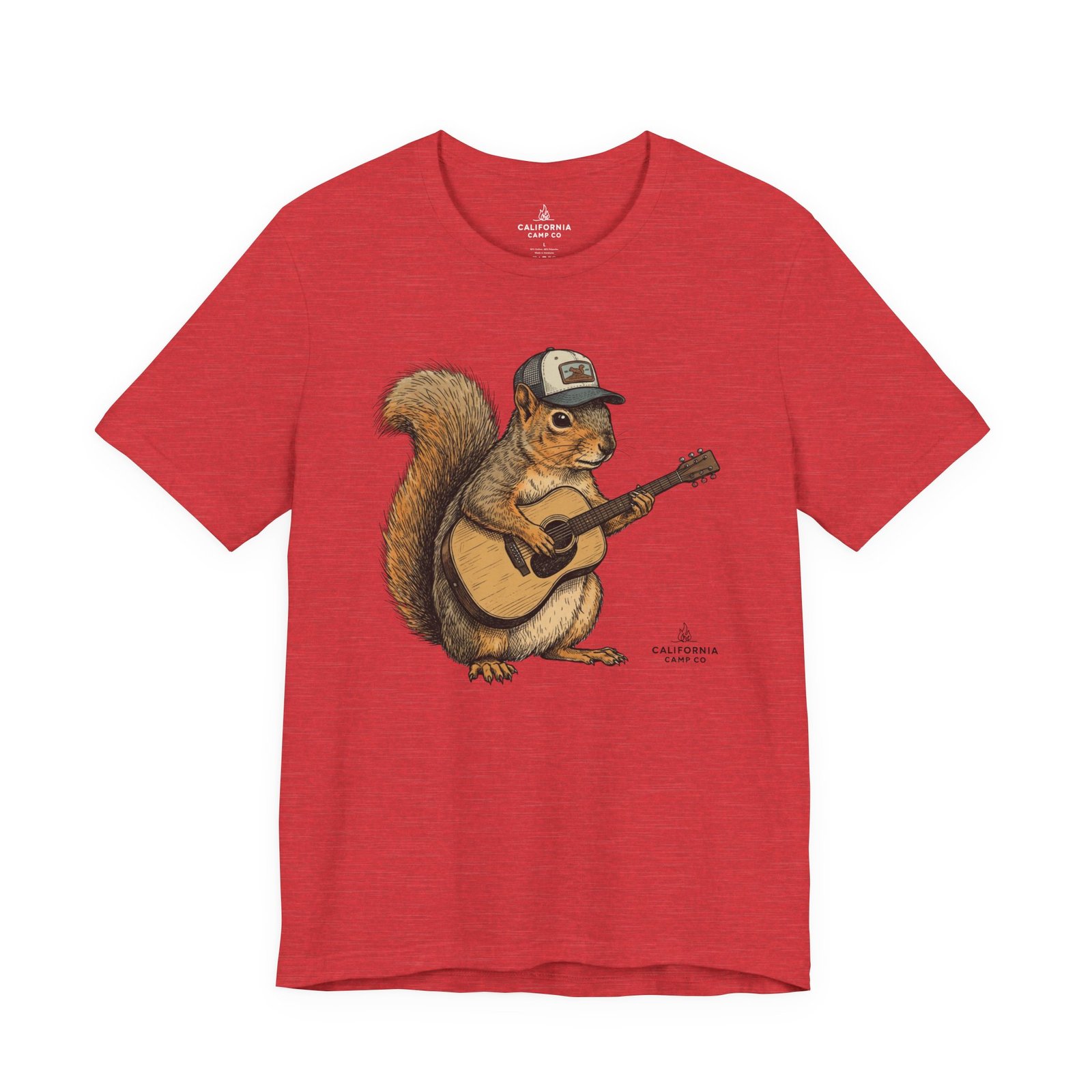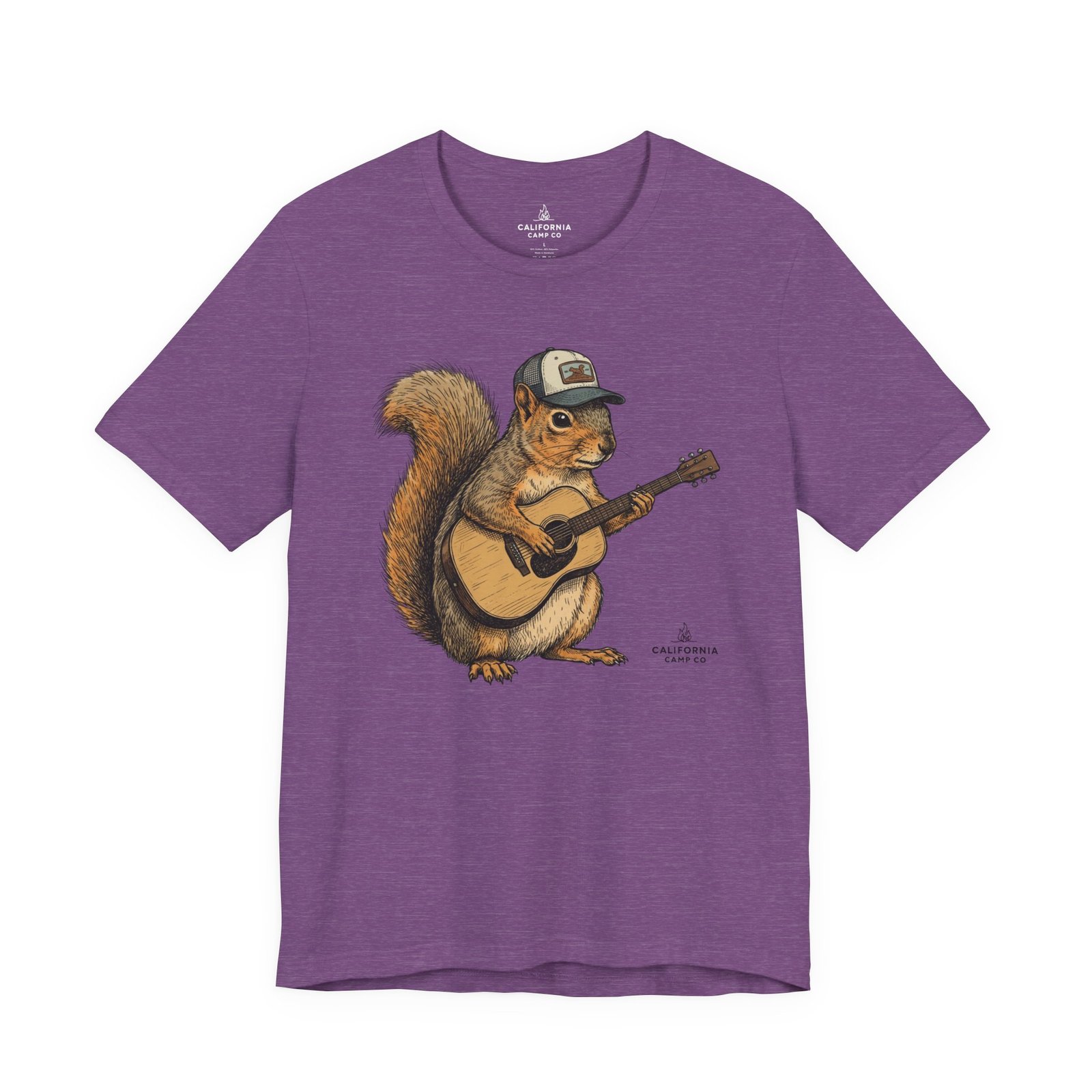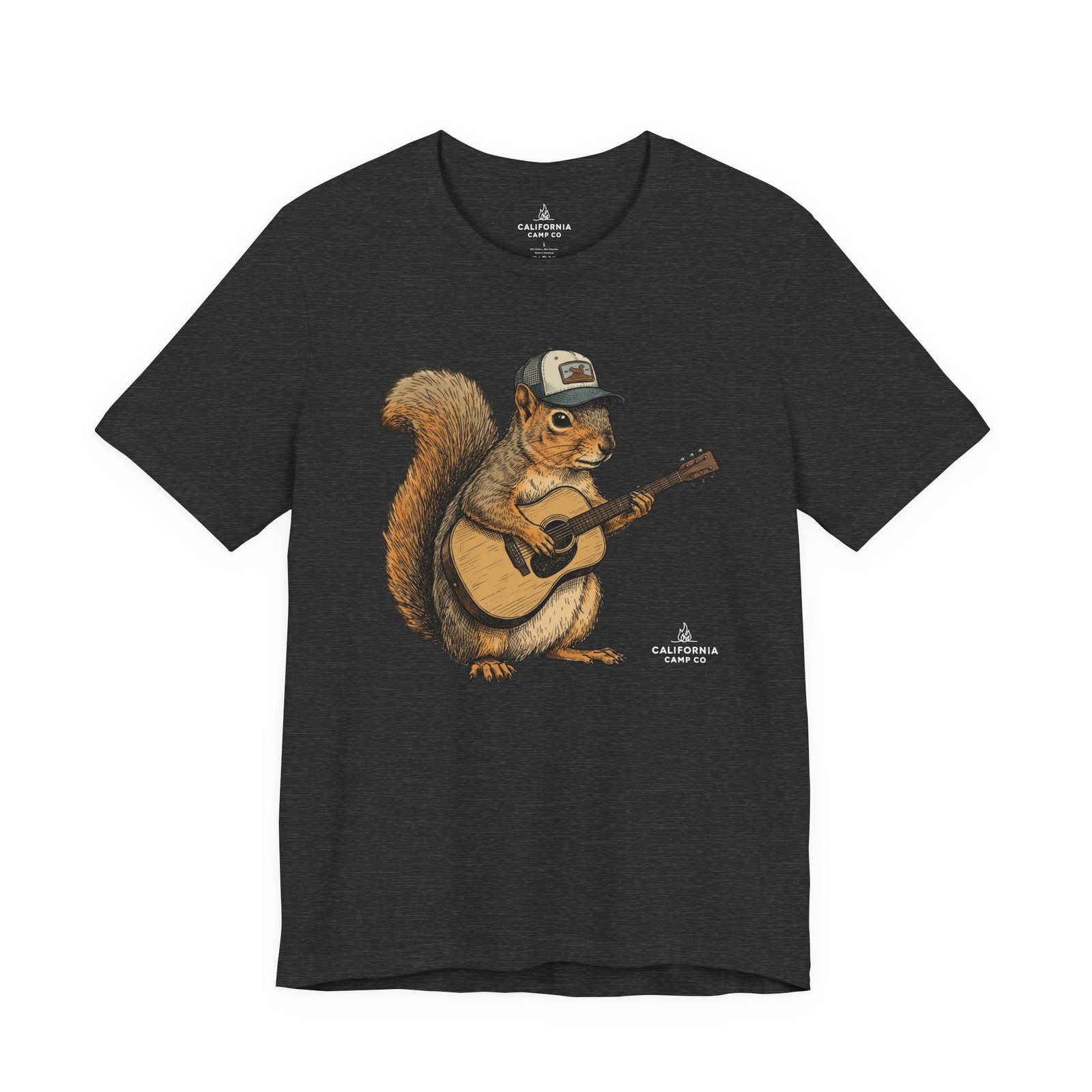 Lightweight, breathable tee that feels lived-in from day one. The soft Airlume cotton fabric drapes casually, while the ribbed crew neck and side seams keep the shape through active days. On the front, a hand-illustrated squirrel in a trucker cap strums an acoustic guitar — a little roadside troubadour that brings quiet charm to hikes, coffee runs, and slow Sundays. Wear it layered under a flannel for campfire nights or on its own for easy, music-filled afternoons. The printed neck label is soft against skin and the tear-away option keeps irritation away. Responsibly made and REACH certified, this shirt blends comfort, conscience, and a touch of rustic humor.