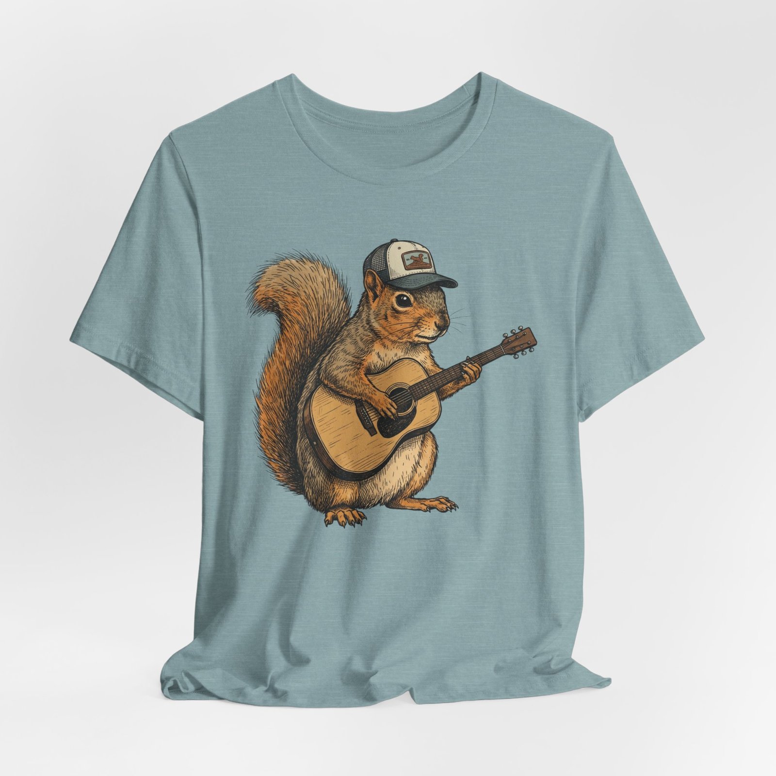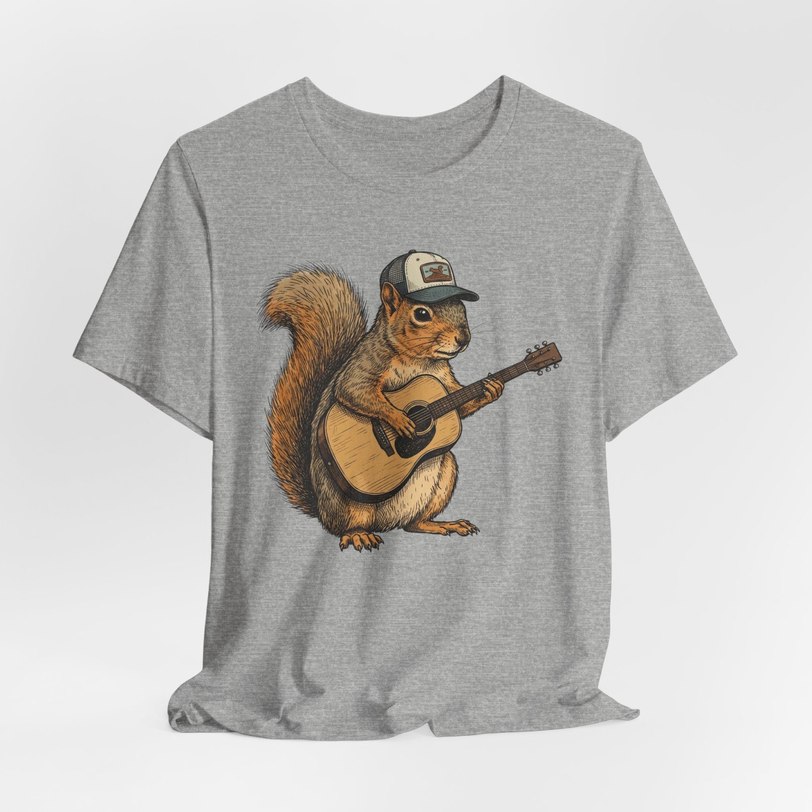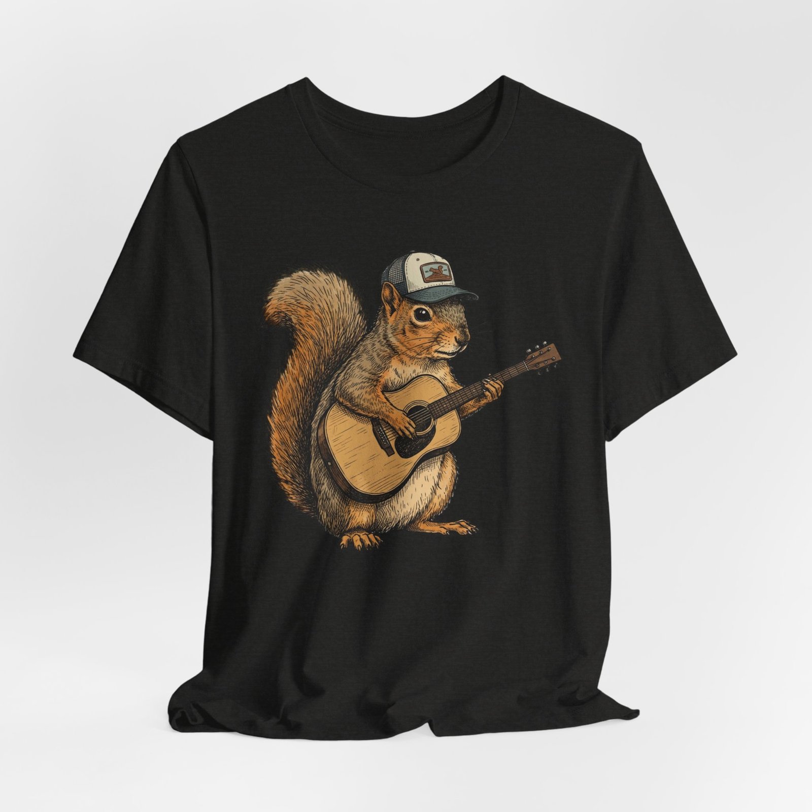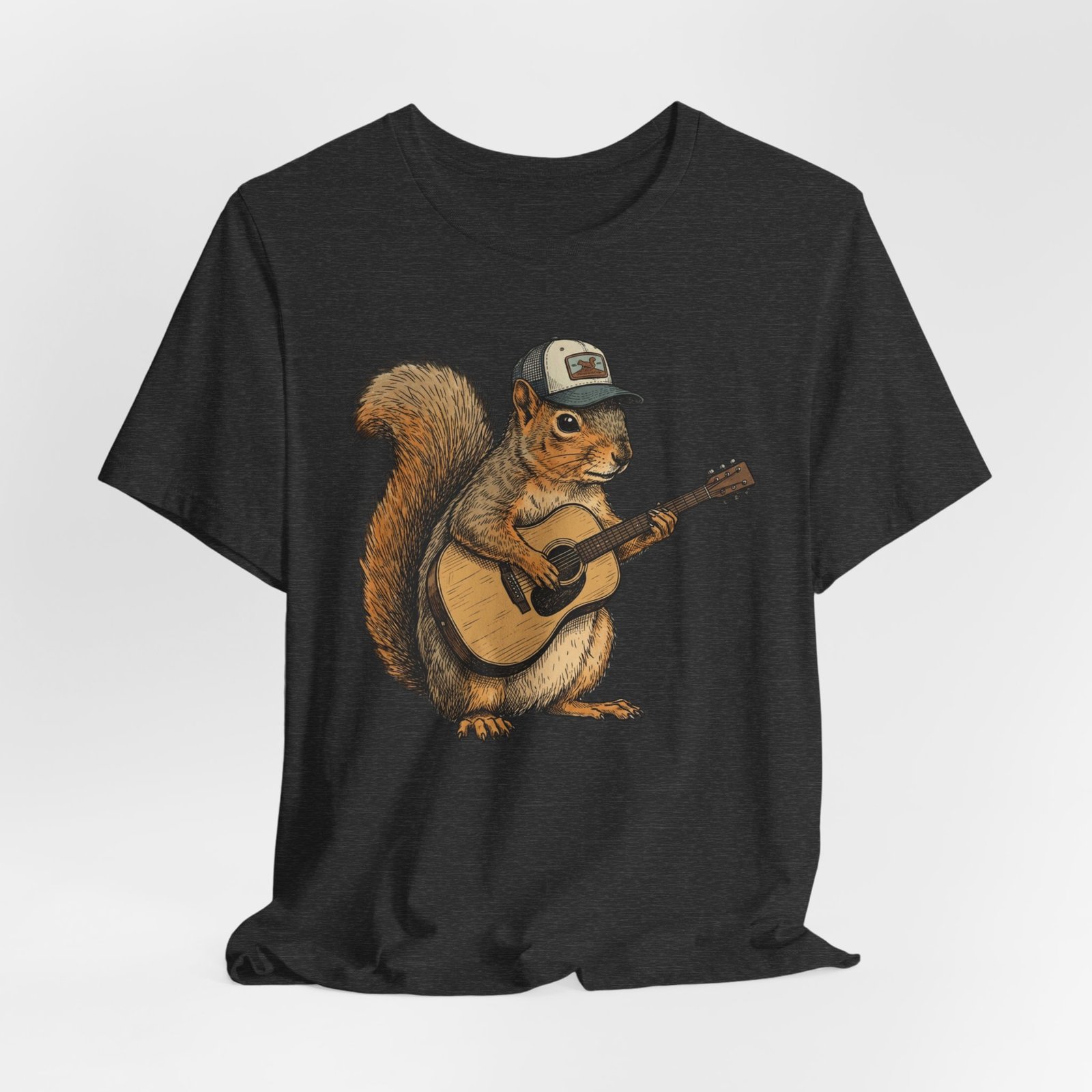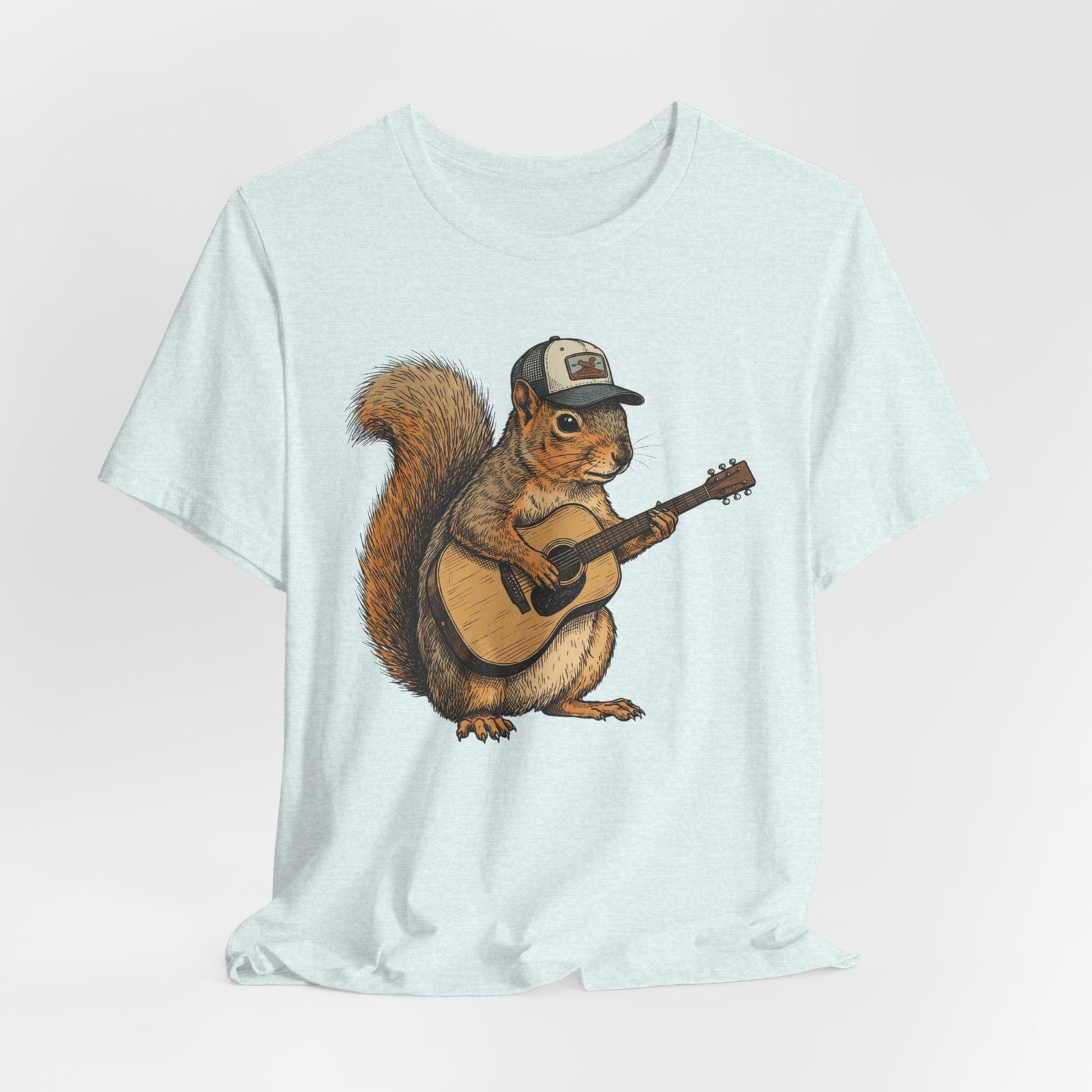 Lightweight, breathable tee that feels lived-in from day one. The soft Airlume cotton fabric drapes casually, while the ribbed crew neck and side seams keep the shape through active days. On the front, a hand-illustrated squirrel in a trucker cap strums an acoustic guitar — a little roadside troubadour that brings quiet charm to hikes, coffee runs, and slow Sundays. Wear it layered under a flannel for campfire nights or on its own for easy, music-filled afternoons. The printed neck label is soft against skin and the tear-away option keeps irritation away. Responsibly made and REACH certified, this shirt blends comfort, conscience, and a touch of rustic humor.