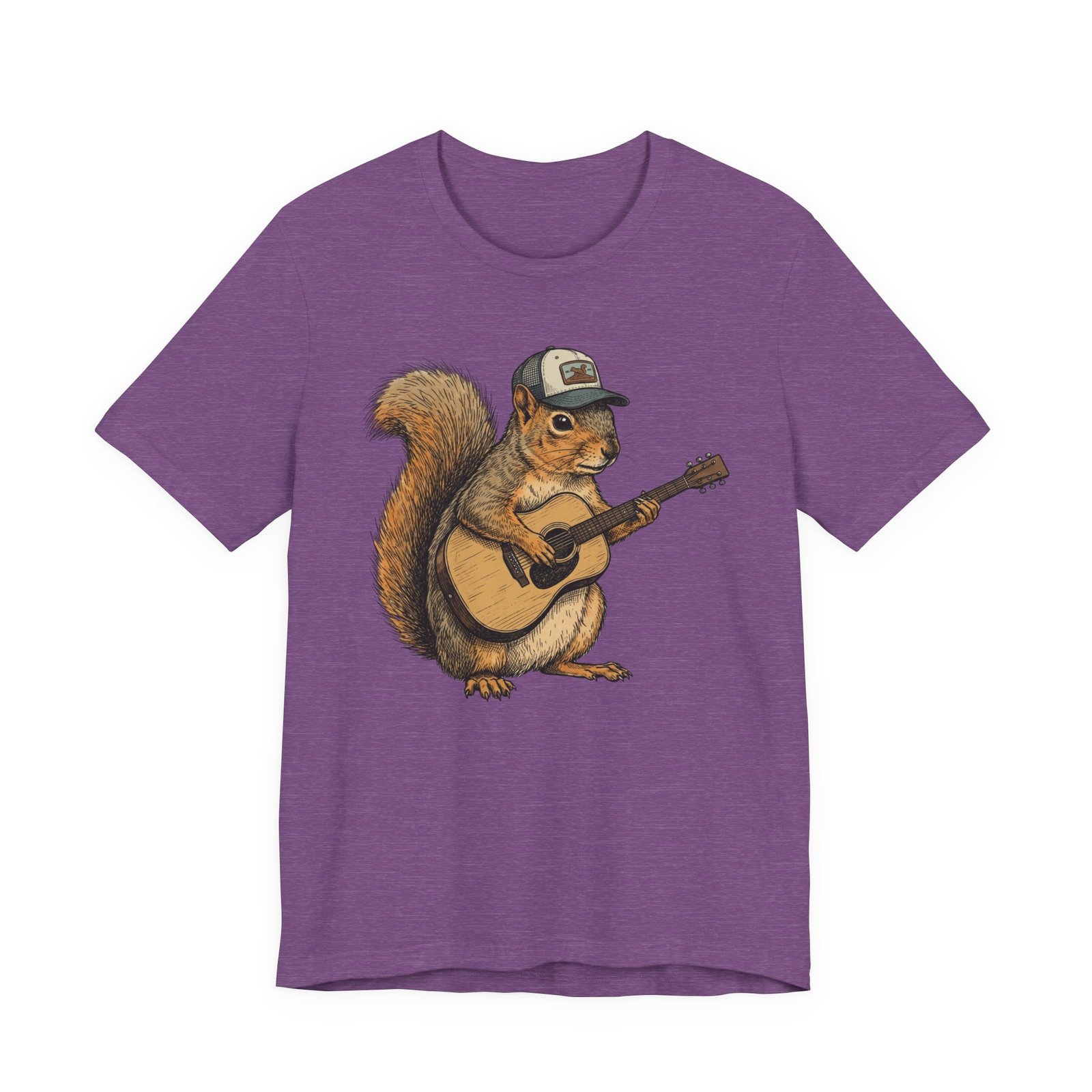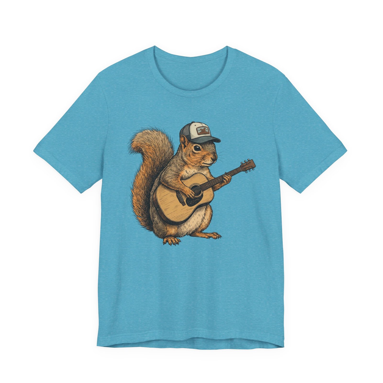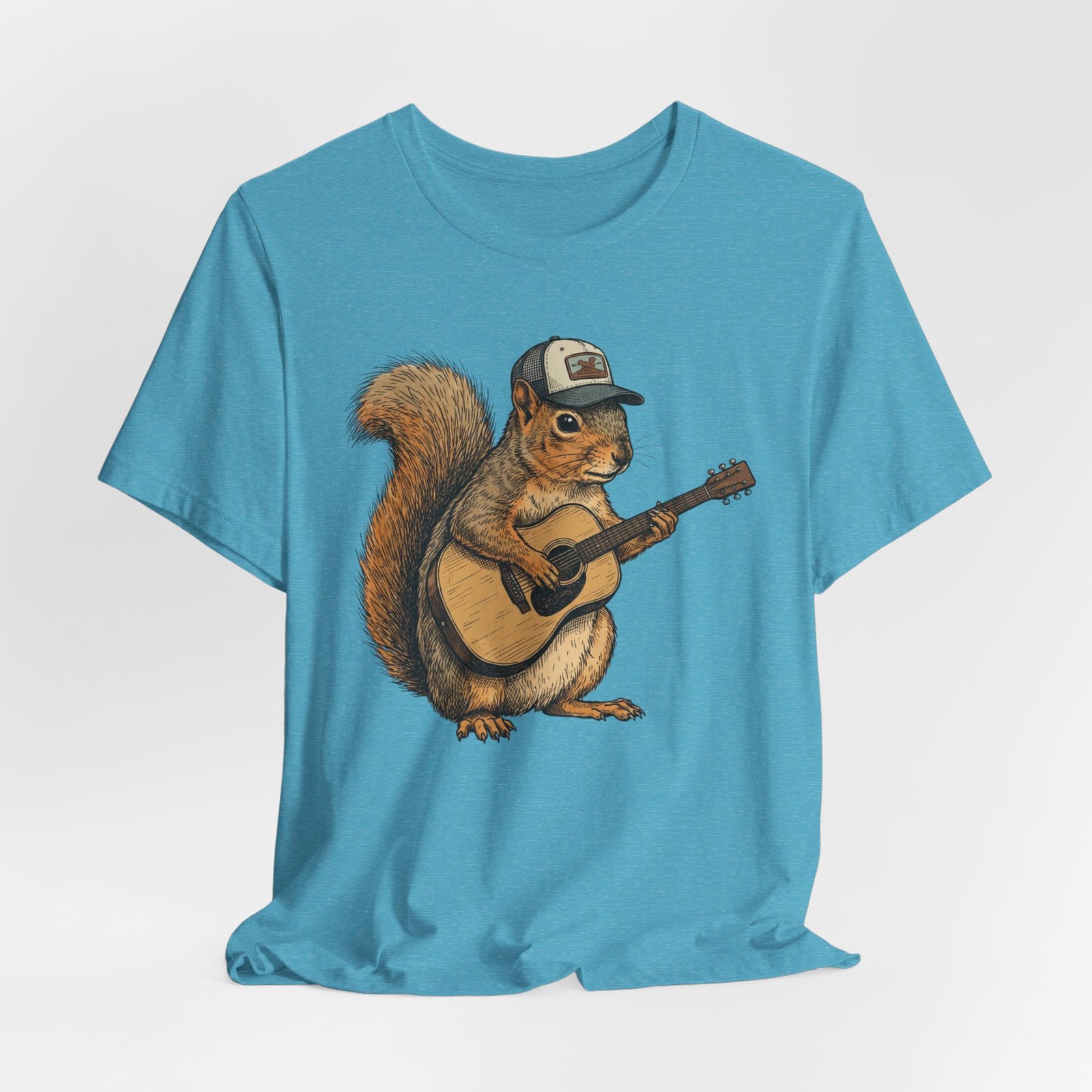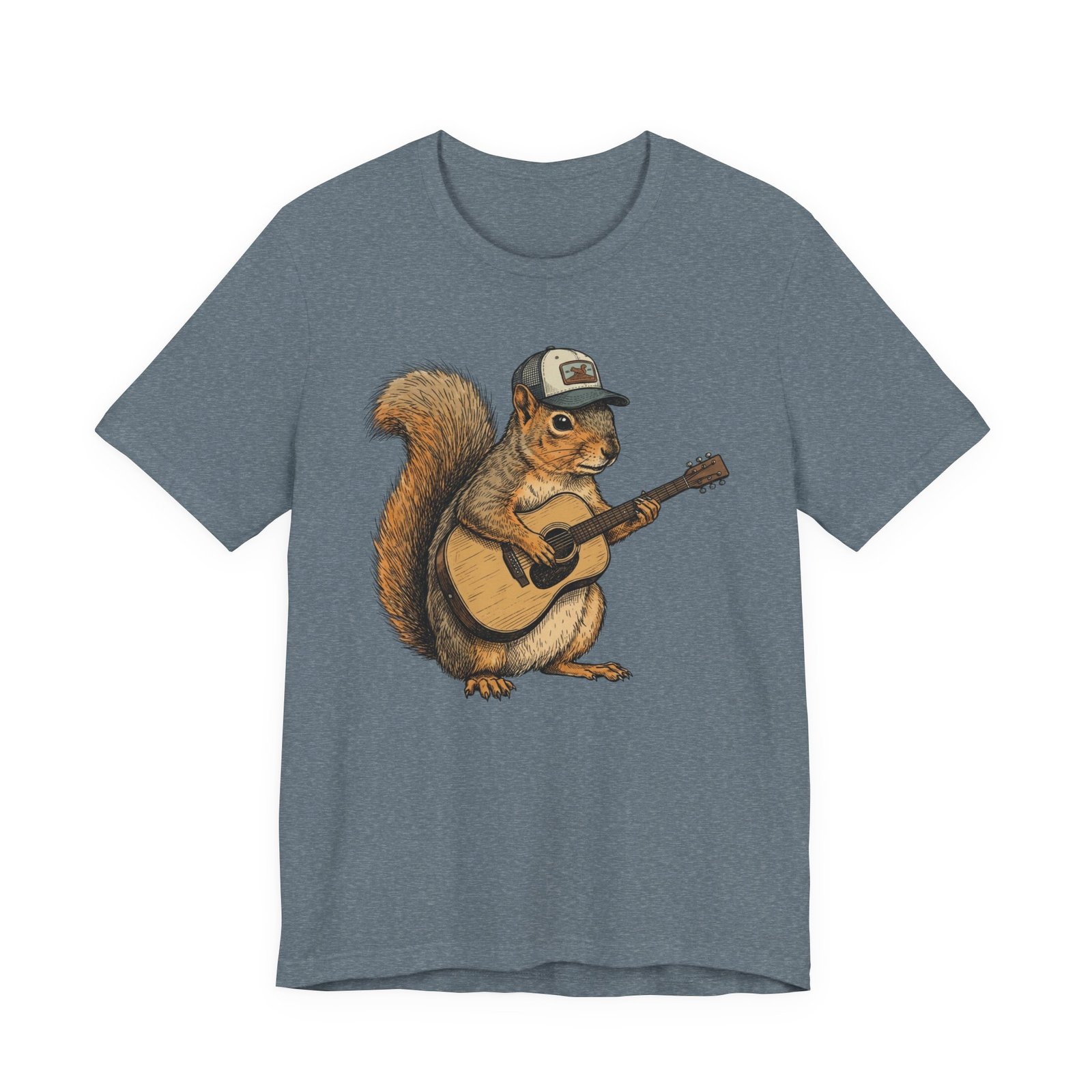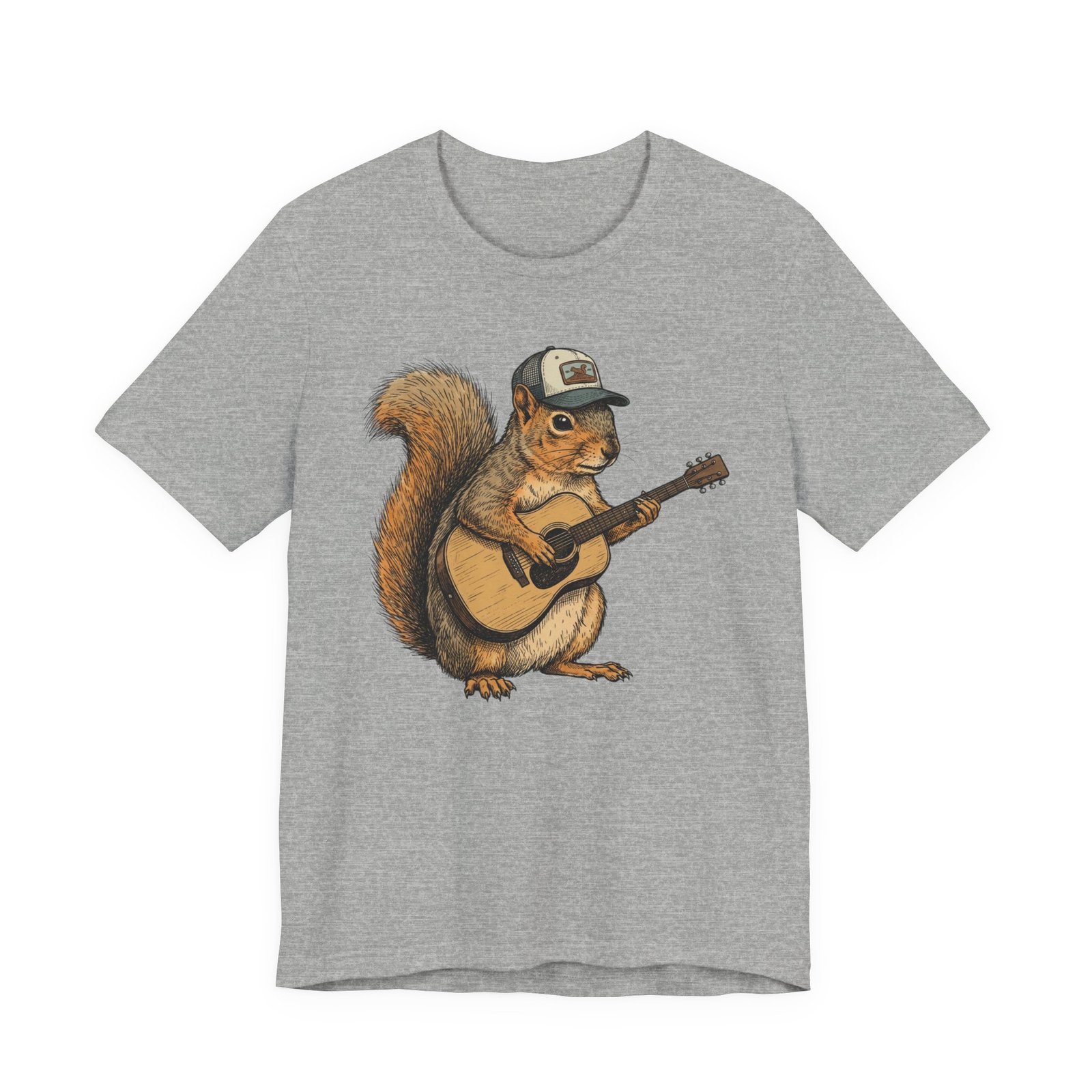 Lightweight, breathable tee that feels lived-in from day one. The soft Airlume cotton fabric drapes casually, while the ribbed crew neck and side seams keep the shape through active days. On the front, a hand-illustrated squirrel in a trucker cap strums an acoustic guitar — a little roadside troubadour that brings quiet charm to hikes, coffee runs, and slow Sundays. Wear it layered under a flannel for campfire nights or on its own for easy, music-filled afternoons. The printed neck label is soft against skin and the tear-away option keeps irritation away. Responsibly made and REACH certified, this shirt blends comfort, conscience, and a touch of rustic humor.