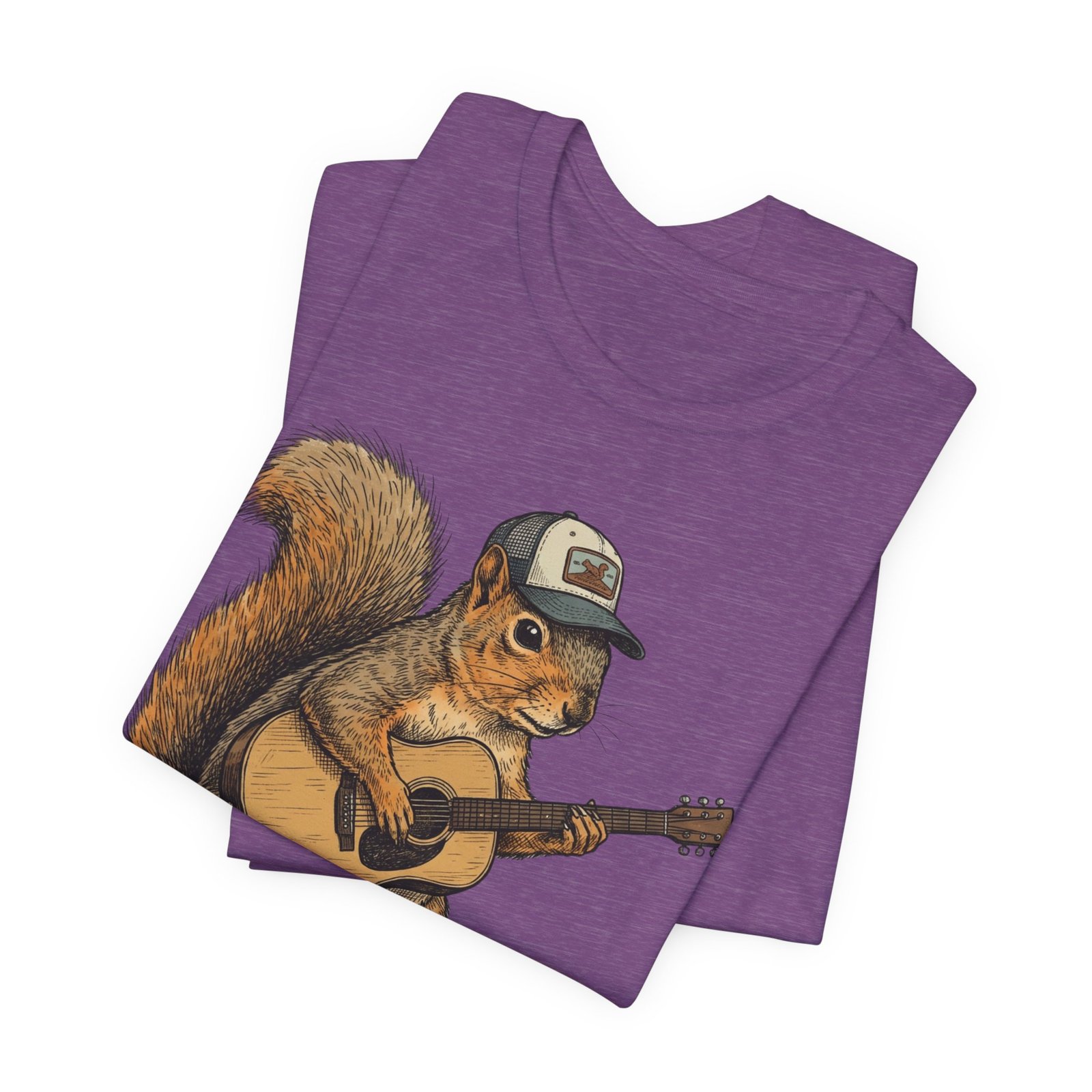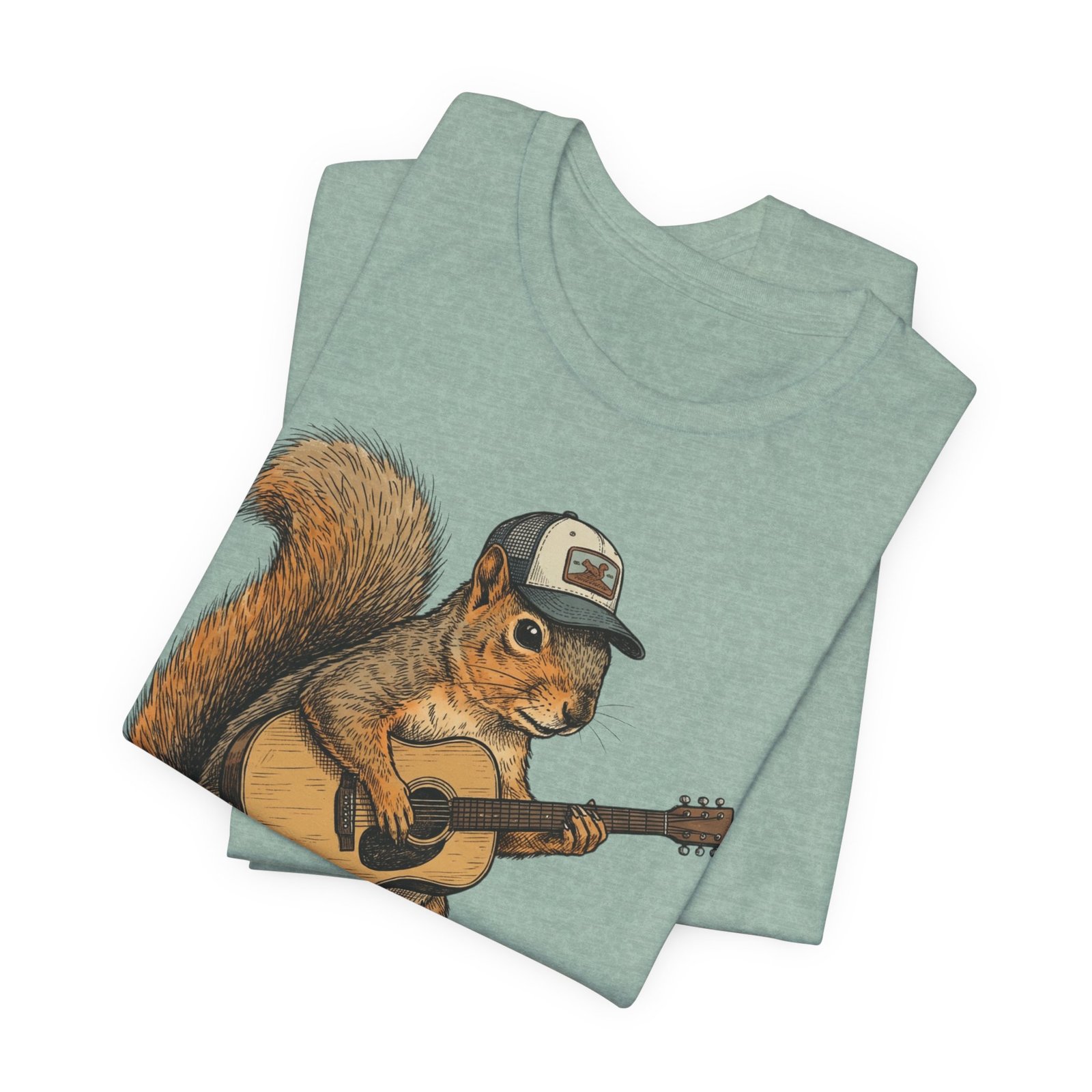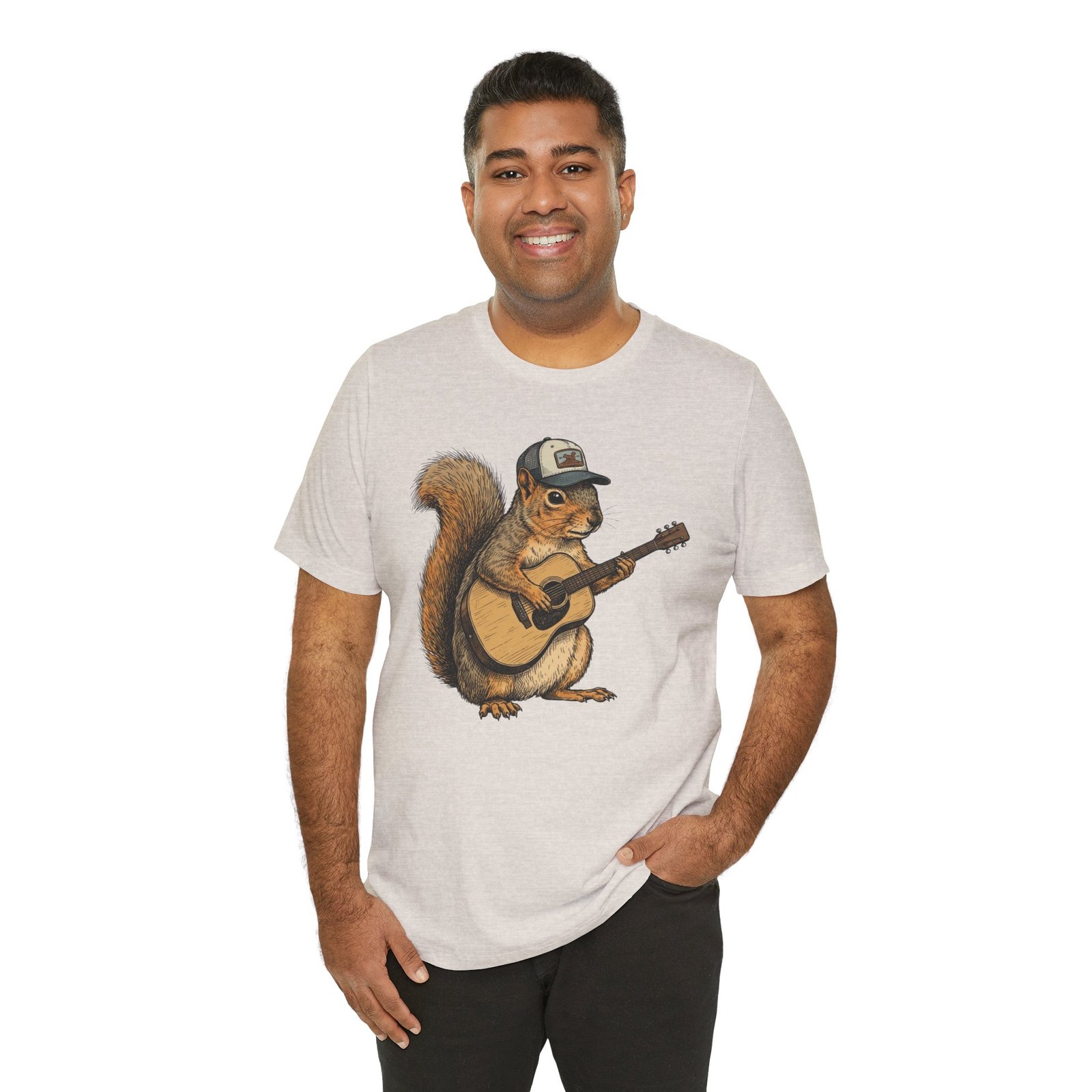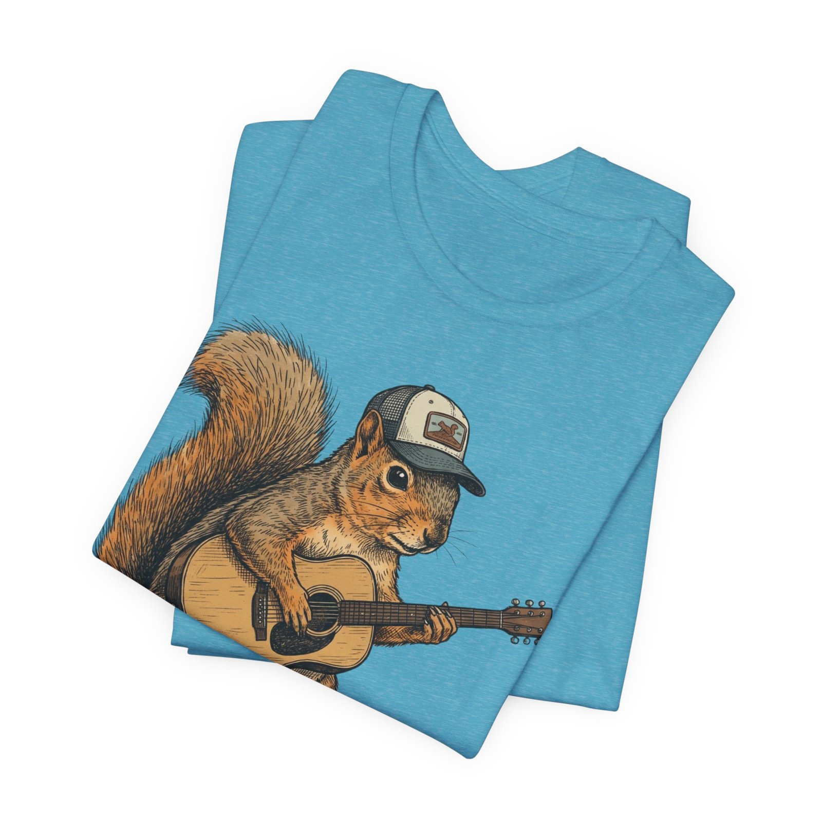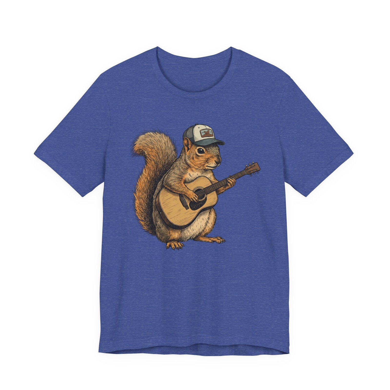 Lightweight, breathable tee that feels lived-in from day one. The soft Airlume cotton fabric drapes casually, while the ribbed crew neck and side seams keep the shape through active days. On the front, a hand-illustrated squirrel in a trucker cap strums an acoustic guitar — a little roadside troubadour that brings quiet charm to hikes, coffee runs, and slow Sundays. Wear it layered under a flannel for campfire nights or on its own for easy, music-filled afternoons. The printed neck label is soft against skin and the tear-away option keeps irritation away. Responsibly made and REACH certified, this shirt blends comfort, conscience, and a touch of rustic humor.