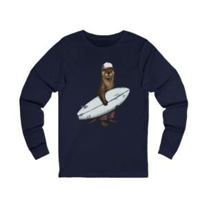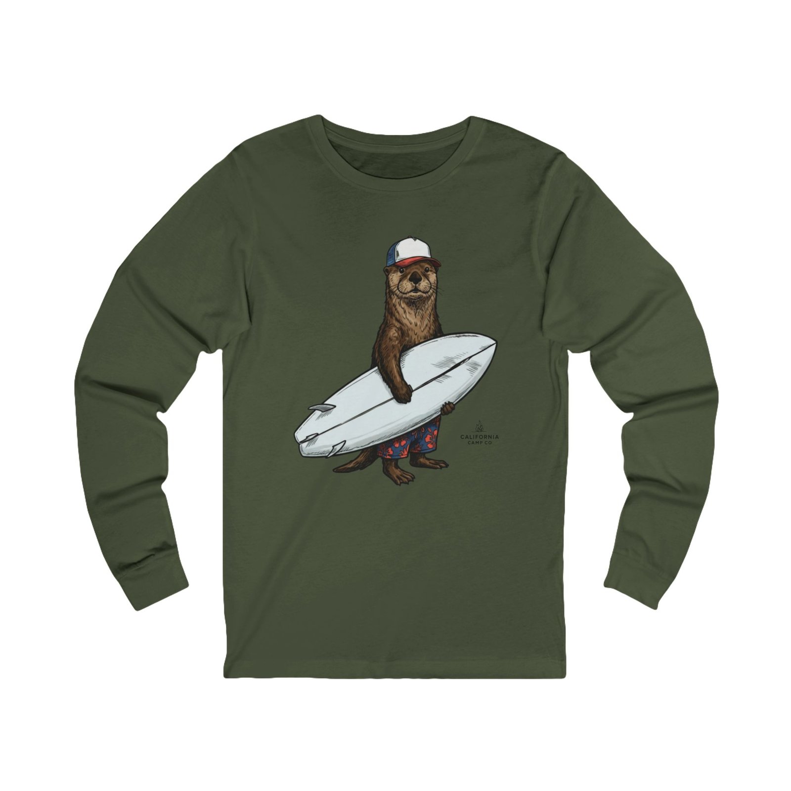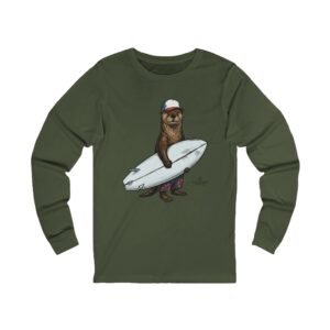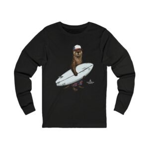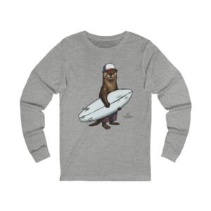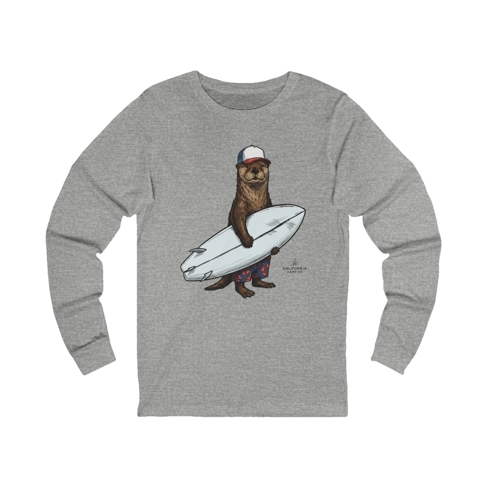 Light, breezy long-sleeve tee that feels like a slow morning at the beach. The shirt’s soft, low-weight fabric drapes easily and the retail fit keeps the silhouette clean without boxing you in. An illustrated otter in a trucker cap carries a well-worn surfboard across the chest — playful, a little nostalgic, and ready for an ocean afternoon. Wear it with rolled sleeves after a dusk surf, layered under a flannel while walking the pier, or lounging at home with coffee and salty air on your skin. The details — side seams, ribbed collar, and taped shoulders — mean this shirt keeps its shape through washes and weekends. With a tear-away label and breathable Airlume cotton, it’s quietly comfortable and built to be reached for again and again.