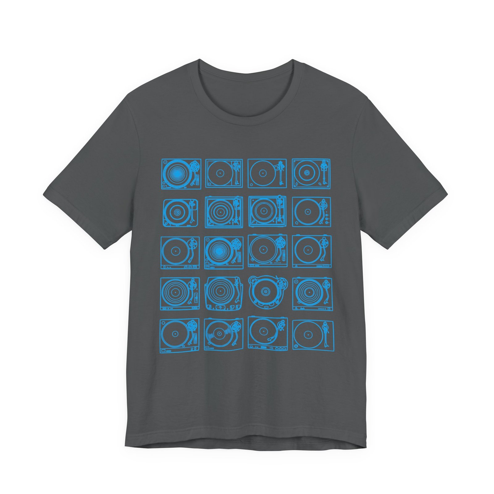 This soft, breathable crew-neck tee brings understated tech flair to everyday wear. The front features a grid of stylized speaker and turntable icons in cool blue tones, arranged like a vintage mixer — it reads as music-obsessed but quiet and confident. Lightweight Airlume cotton feels gentle against the skin and breathes well on long days. The retail fit and ribbed collar keep the silhouette neat whether layered under a jacket or worn solo. Small, thoughtful details — side seams for structure, shoulder tape to prevent stretching, and a tear-away label — make it comfortable for repeated wear. Ethically produced and REACH certified, this tee suits someone who lives around music and design, slipping naturally into gigs, studio days, and city weekends.