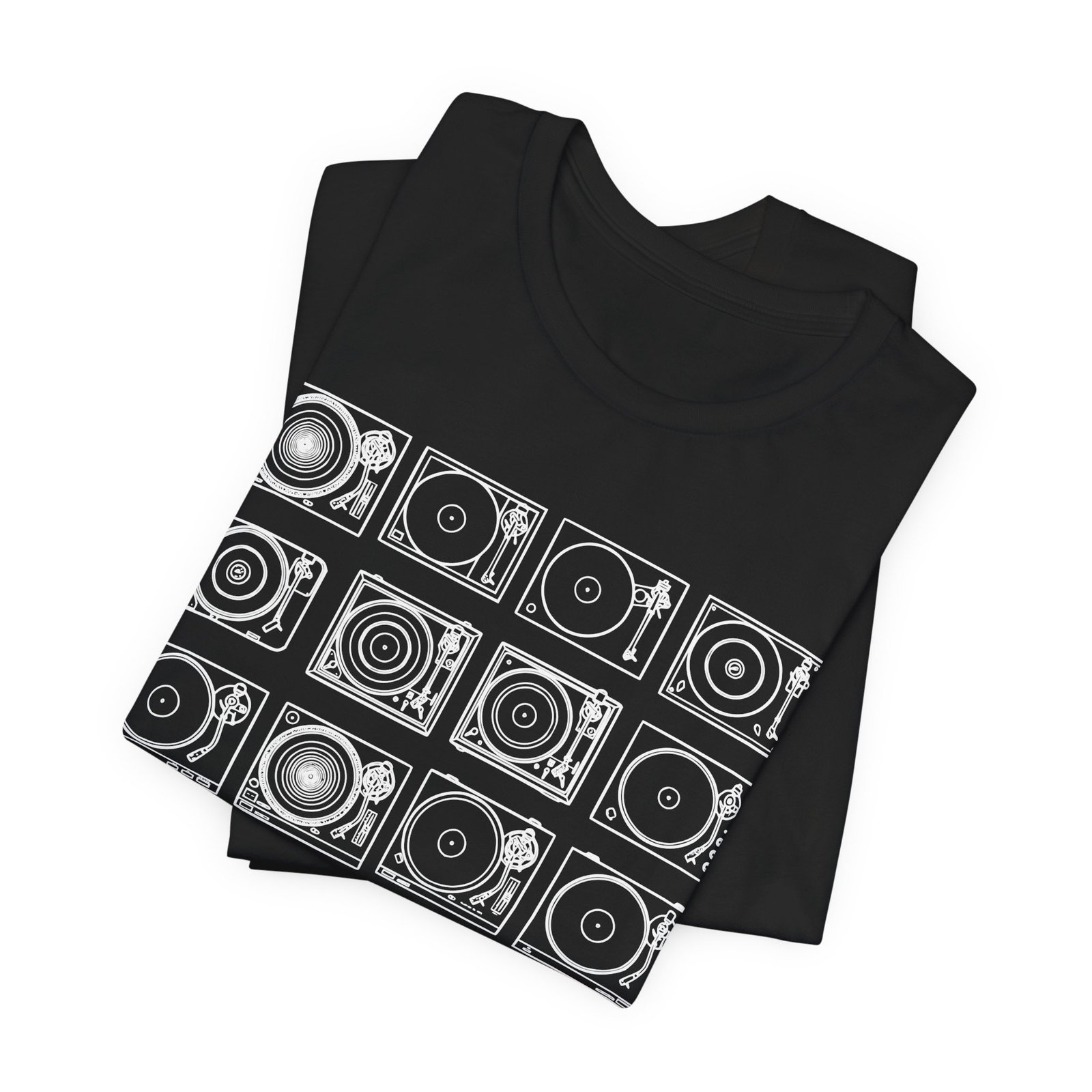 This lightweight crew-neck tee carries a quiet, analog soul—rows of vintage turntable motifs printed across the chest like a crate-digger’s blueprint. Soft Airlume combed cotton drapes easily whether you’re DJing a late-night set, digging through vinyl at a market, or slipping into a neighborhood show. The monochrome design reads like a playlist in blocks: familiar, precise, and a little nostalgic. It layers under jackets, pairs with worn-in jeans, and moves with you from record shop to rooftop session. The shirt feels lived-in from the first wear and keeps the focus on what matters—the music, the hunt, the moment.
