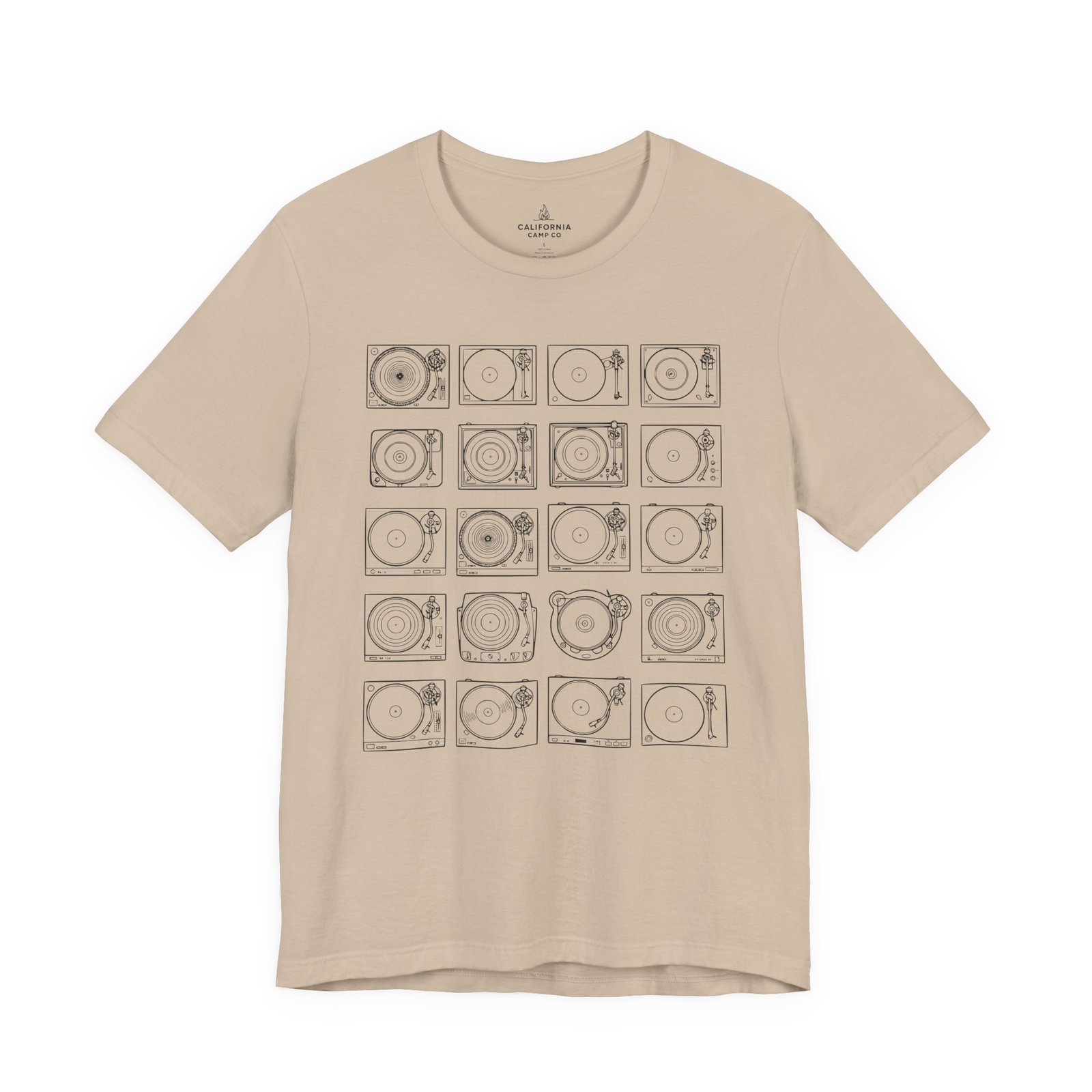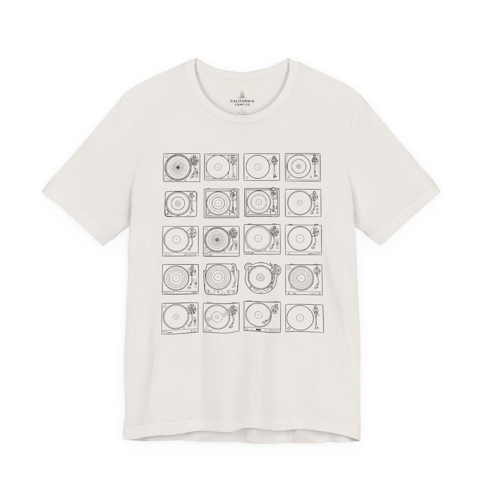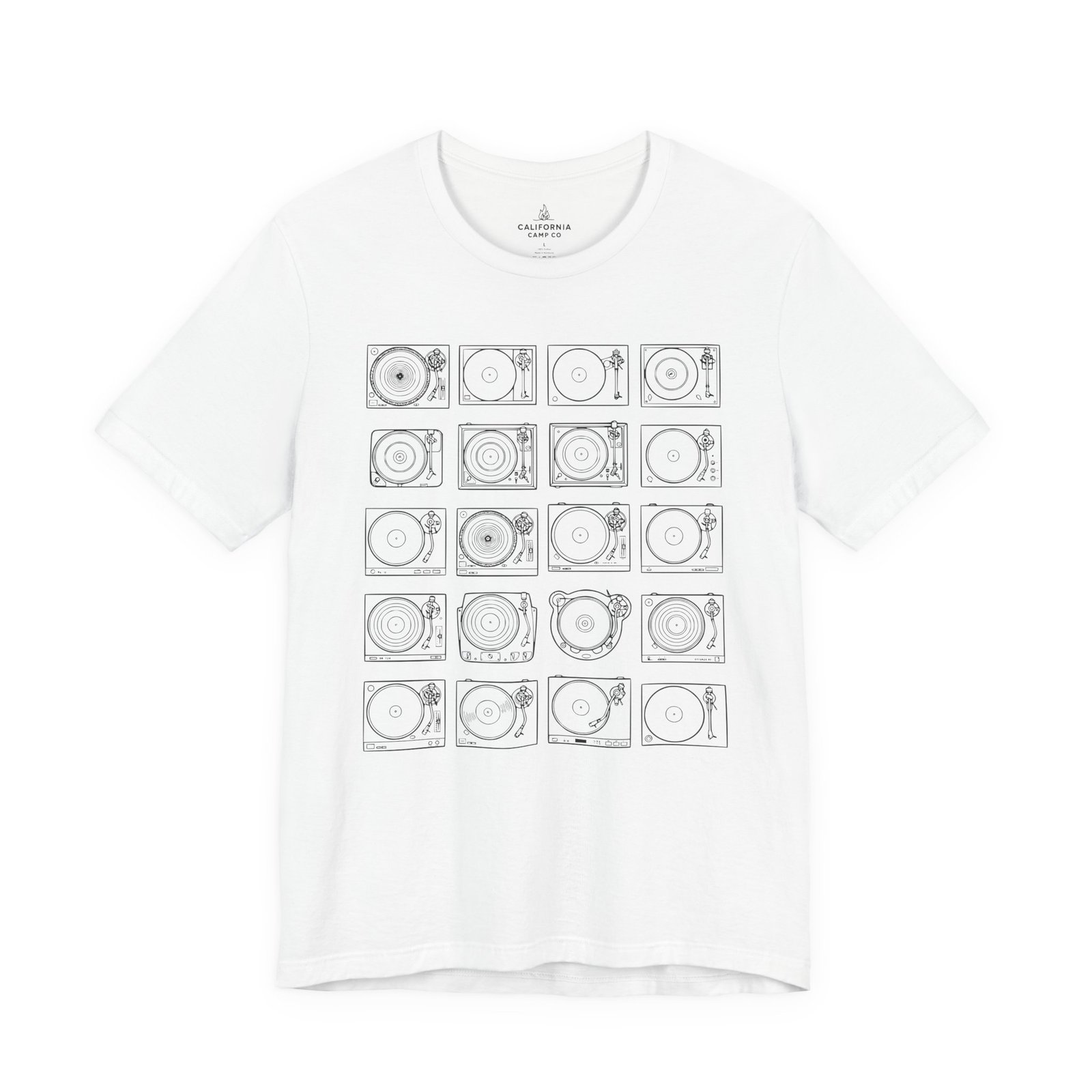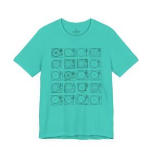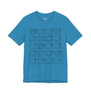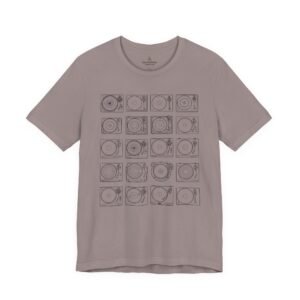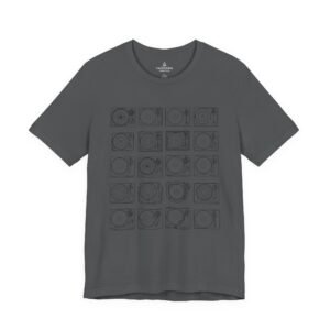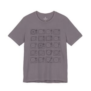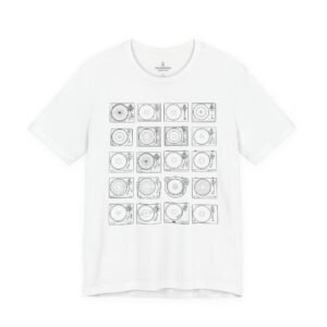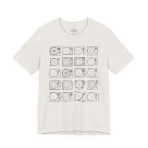This lightweight jersey tee brings calm geometry and quiet rhythm to your everyday wardrobe. A grid of minimalist turntable and record line-art sits centered on the tee — subtle enough to layer under a jacket, distinctive enough to start conversations at a cafe or record shop. The fabric breathes during long days; the ribbed crew neck and side seams keep the silhouette neat without feeling stiff. Wear it while crate-digging, sketching album covers, or sharing mixes with friends — it feels lived-in from the first wear and ages with character.