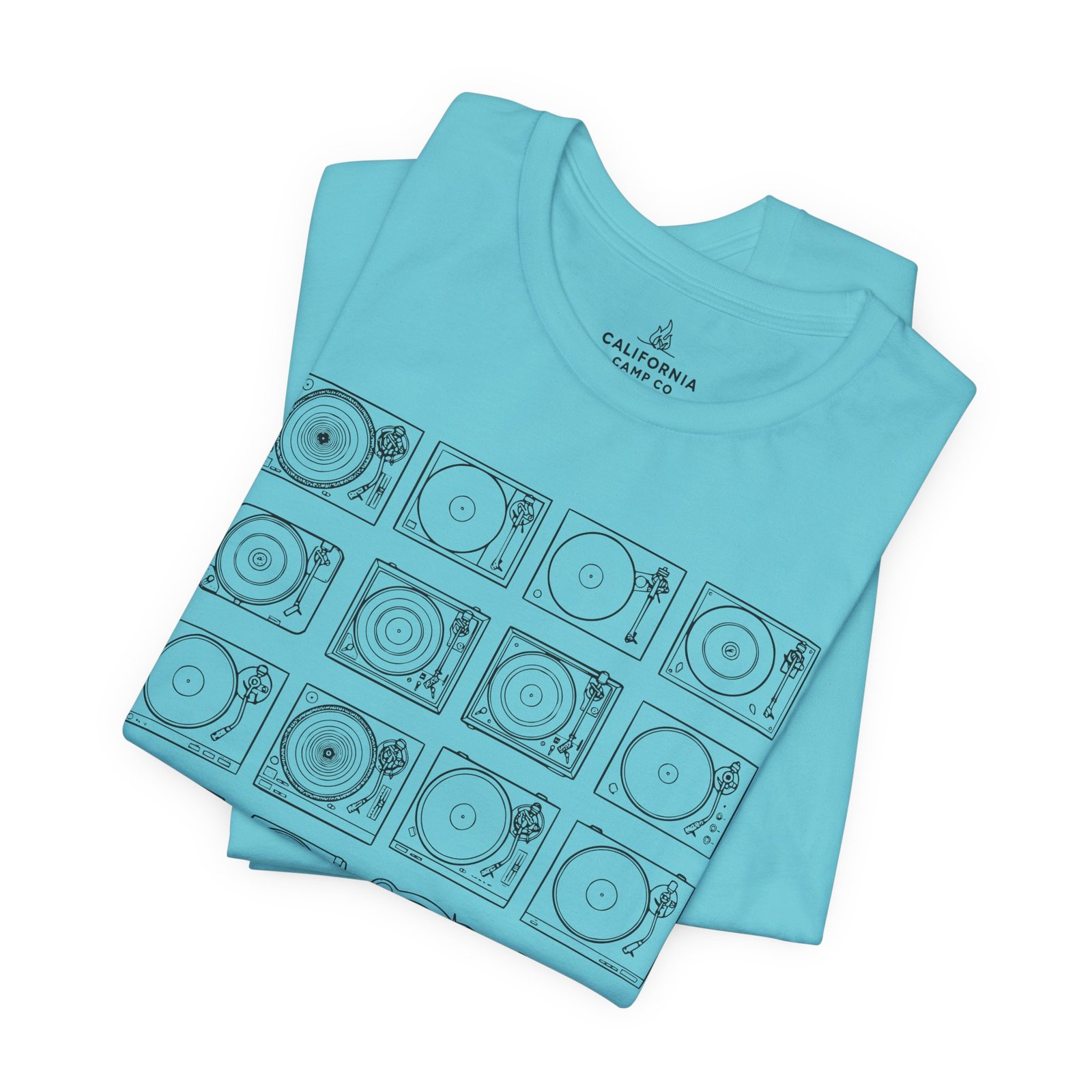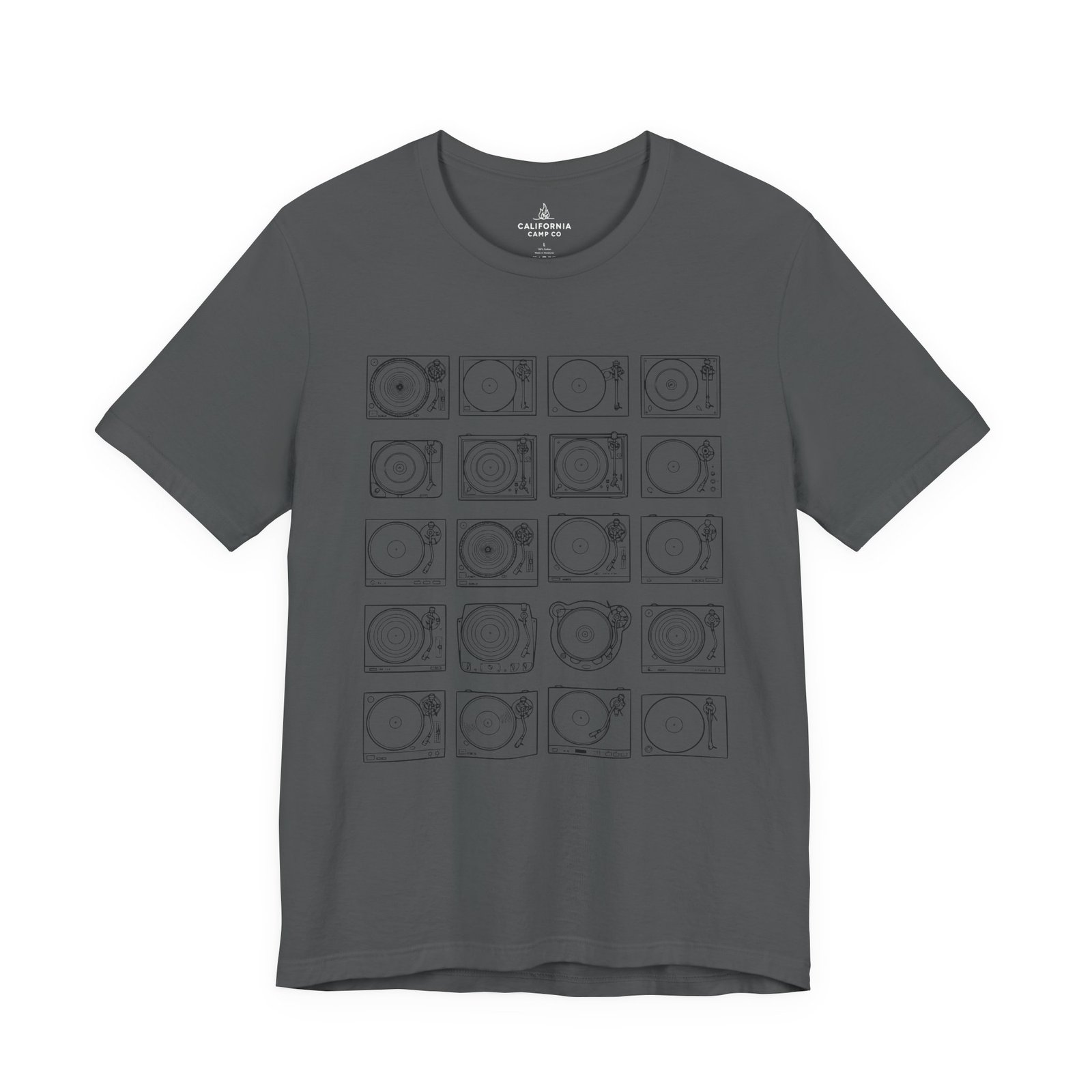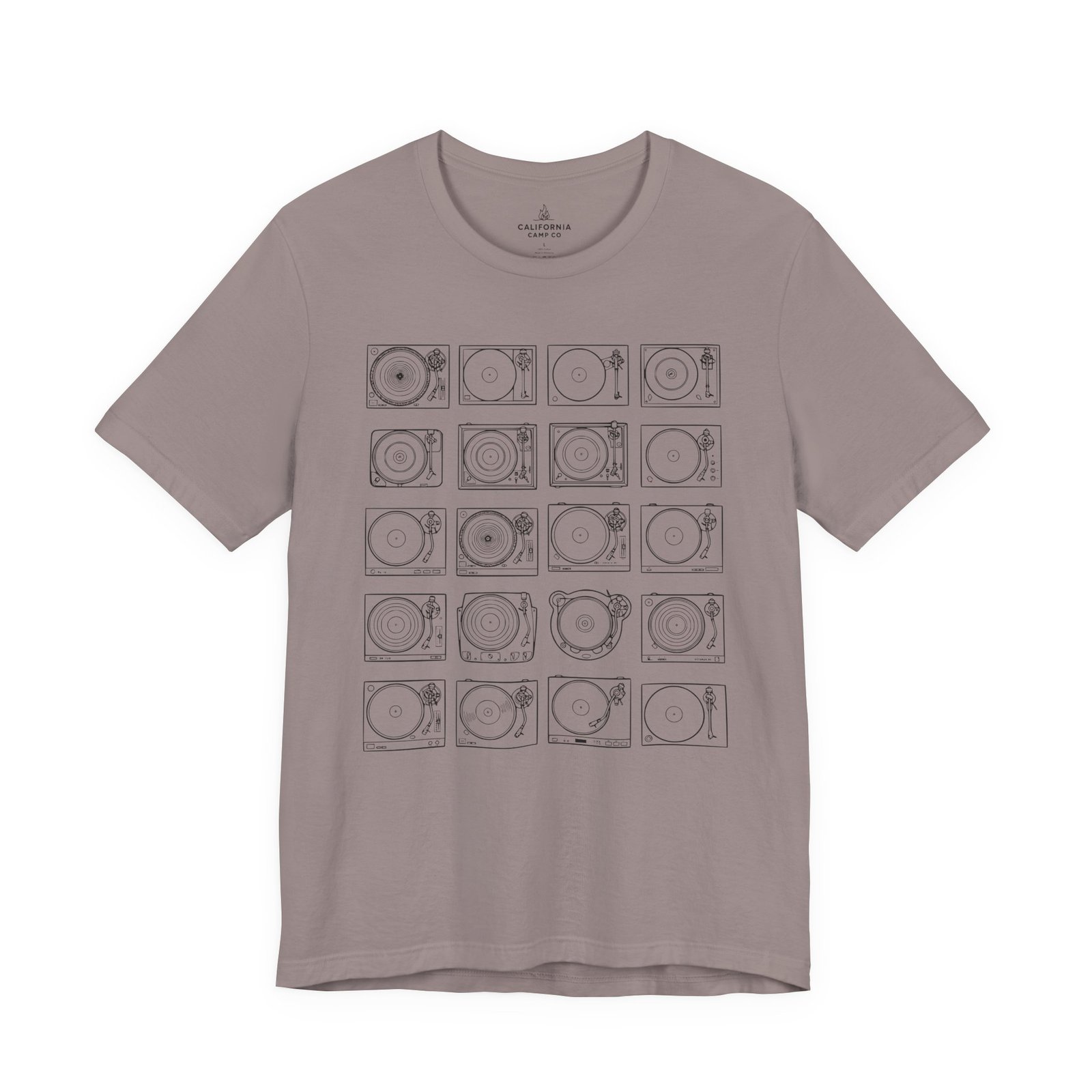 This lightweight jersey tee brings calm geometry and quiet rhythm to your everyday wardrobe. A grid of minimalist turntable and record line-art sits centered on the tee — subtle enough to layer under a jacket, distinctive enough to start conversations at a cafe or record shop. The fabric breathes during long days; the ribbed crew neck and side seams keep the silhouette neat without feeling stiff. Wear it while crate-digging, sketching album covers, or sharing mixes with friends — it feels lived-in from the first wear and ages with character.