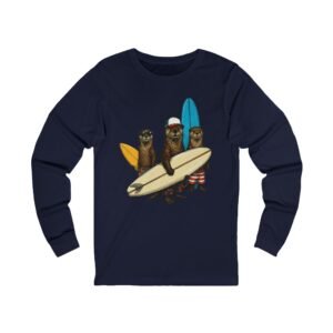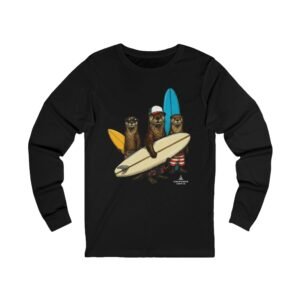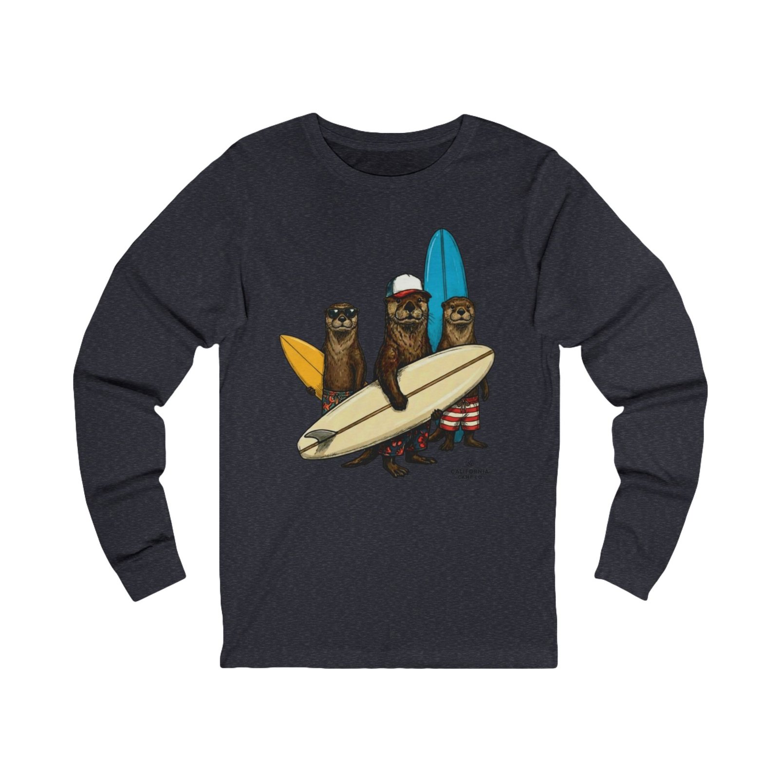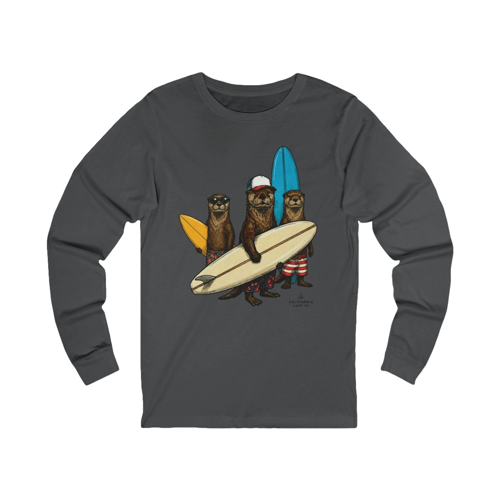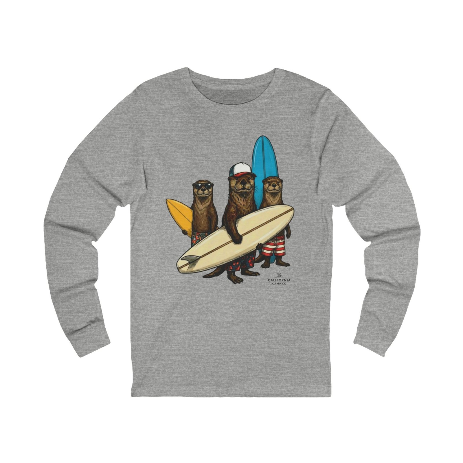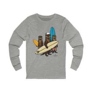 Light, breezy long-sleeve tee featuring a playful illustration of three otters with surfboards — sun-worn stoke, salty air, and the kind of easy camaraderie that makes a morning lineup feel like home. The slim retail fit and soft Airlume cotton give it a worn-in comfort that layers well under a hoodie or stands on its own during cooler beach evenings. Wear it to the pier, a bonfire, or while planning the next tide — it settles into the rhythm of surf days and slow afternoons alike.